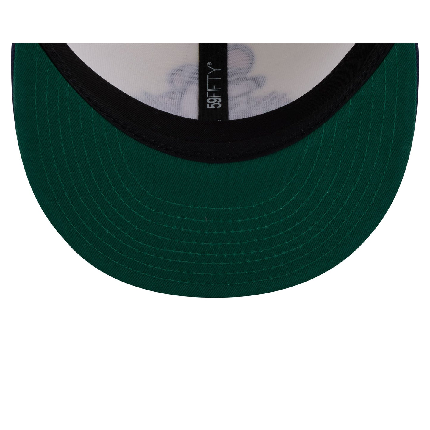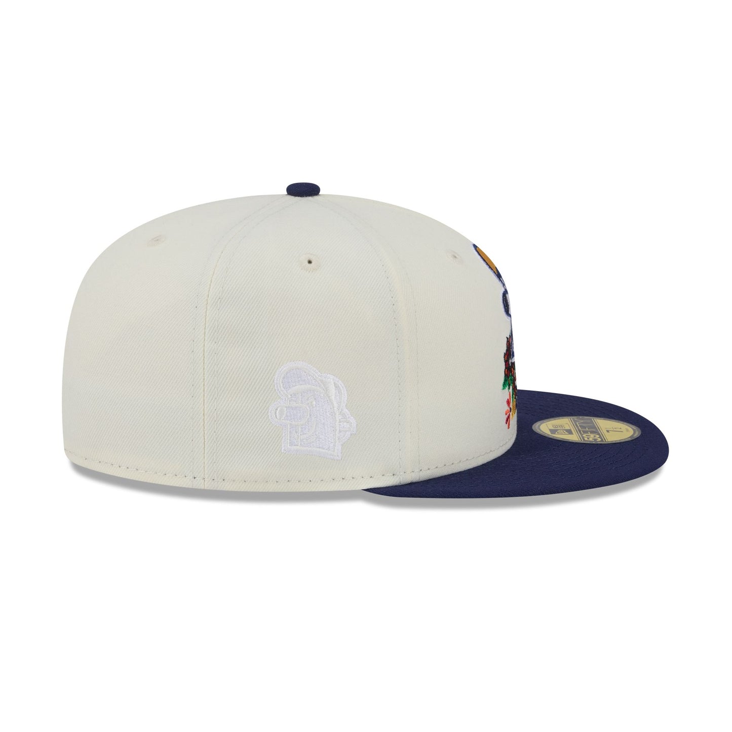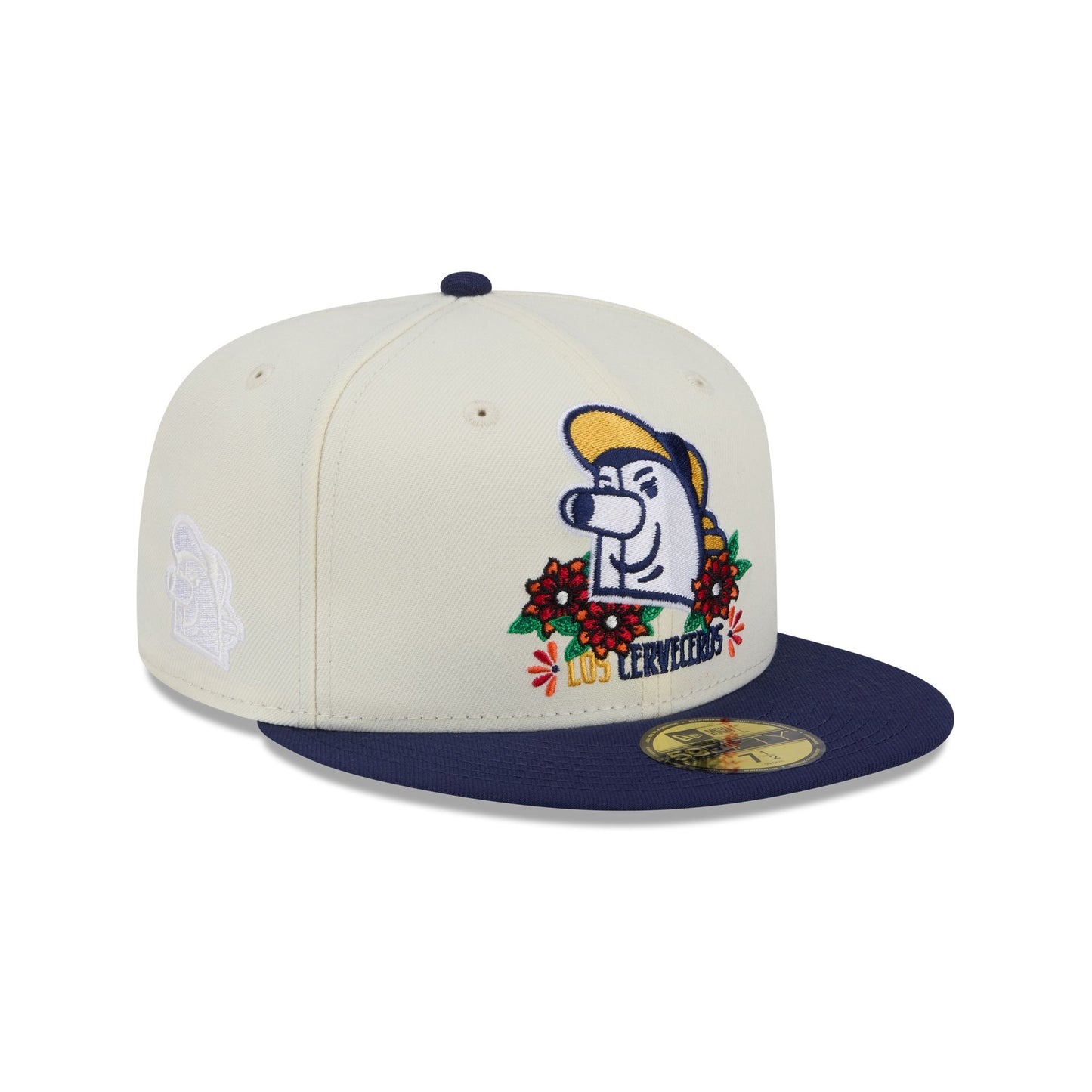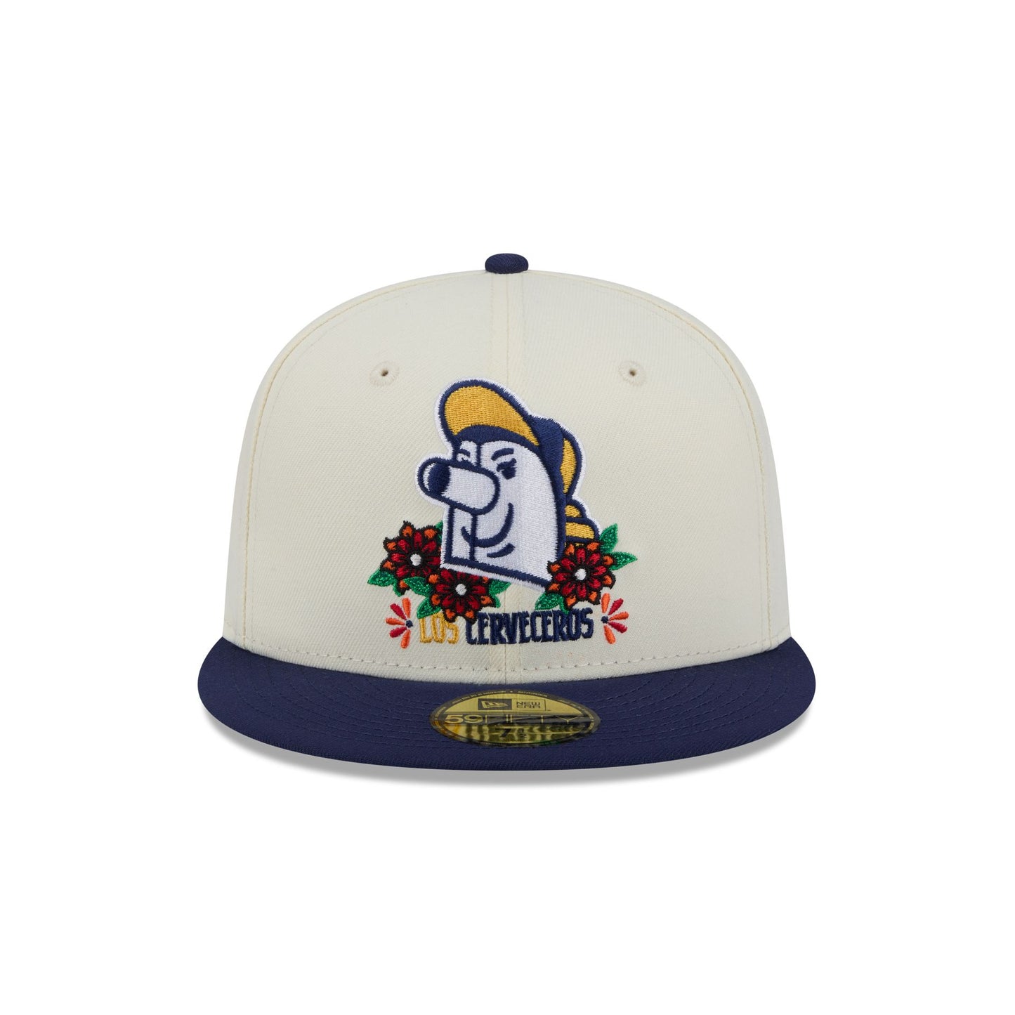 The Milwaukee Brewers Day of the Dead Sugar Skull Mascot 59FIFTY Fitted Cap features an embroidered Brewers Mascot with flowers at the front panels with a skeletal mascot at the right-wear side. Additional details include the MLB Batterman logo at the rear and a green undervisor.