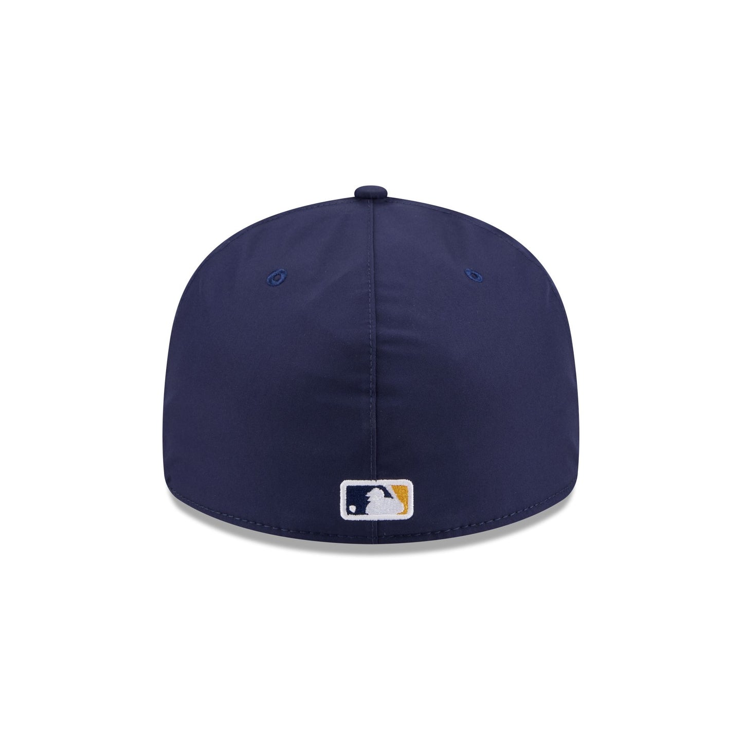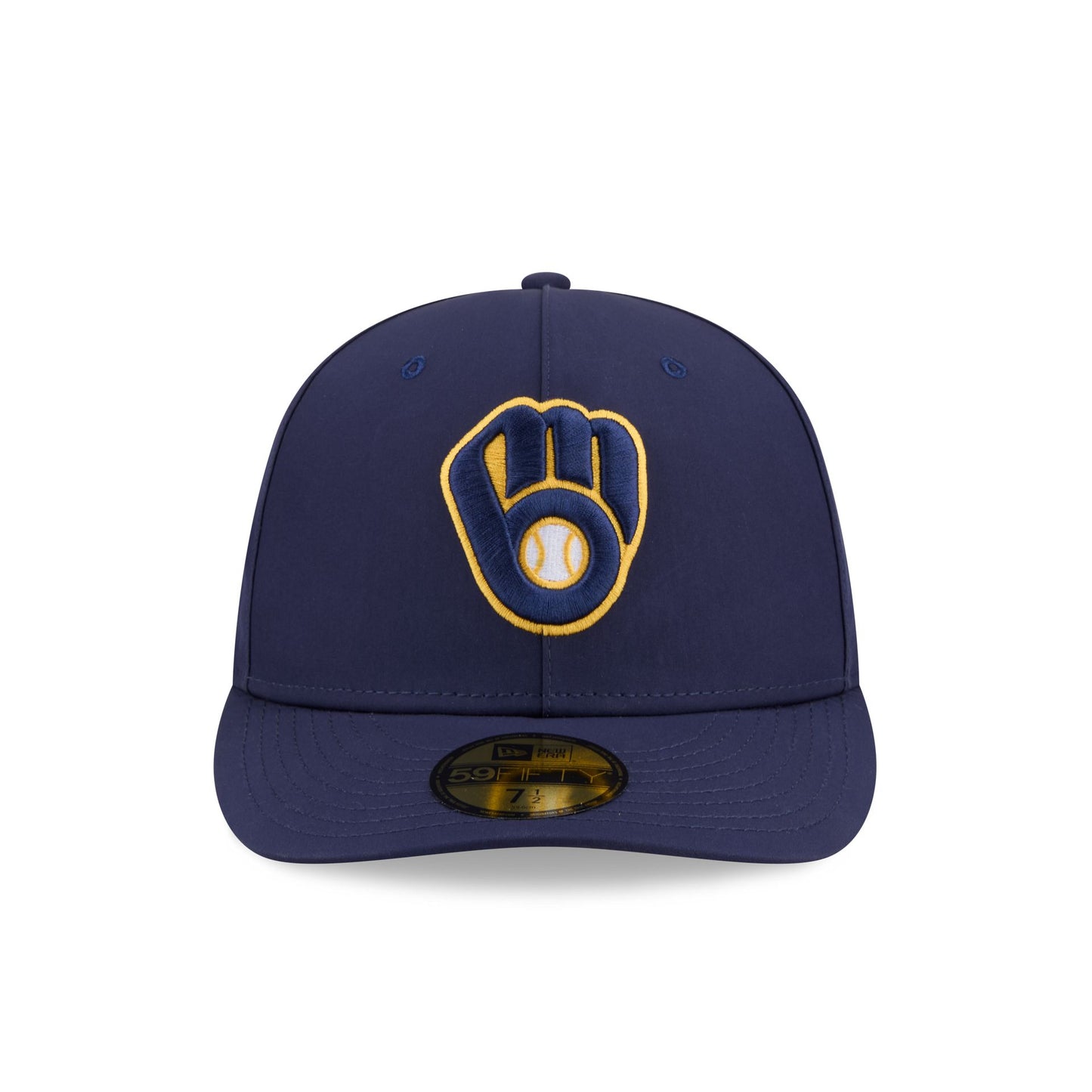 The Milwaukee Brewers GORE-TEX 59FIFTY Fitted Cap features an embroidered Brewers logo at the front panels with a metallic sheen silicone New Era Flag logo and GORE-TEX logo at the left-wear side. Additional details include the MLB Batterman logo at the rear, a gray undervisor, and a polyester fabrication throughout the cap. It is waterproof, breathable, and lightweight. This 59FIFTY comes with a pre-curved visor.