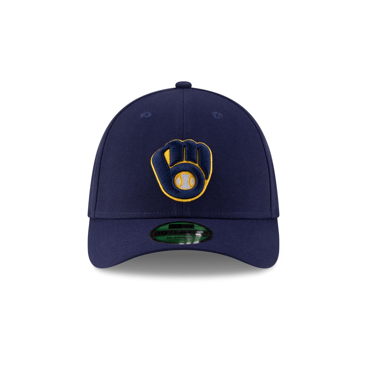 The Milwaukee Brewers Player Replica 39THIRTY M-Crown Stretch Fit Cap features an embroidered Brewers logo at the front panels with a matching MLB Batterman logo at the rear and a black undervisor. Additional details include a Performance Stretch sweatband and a New Era Flag at the left-wear side.