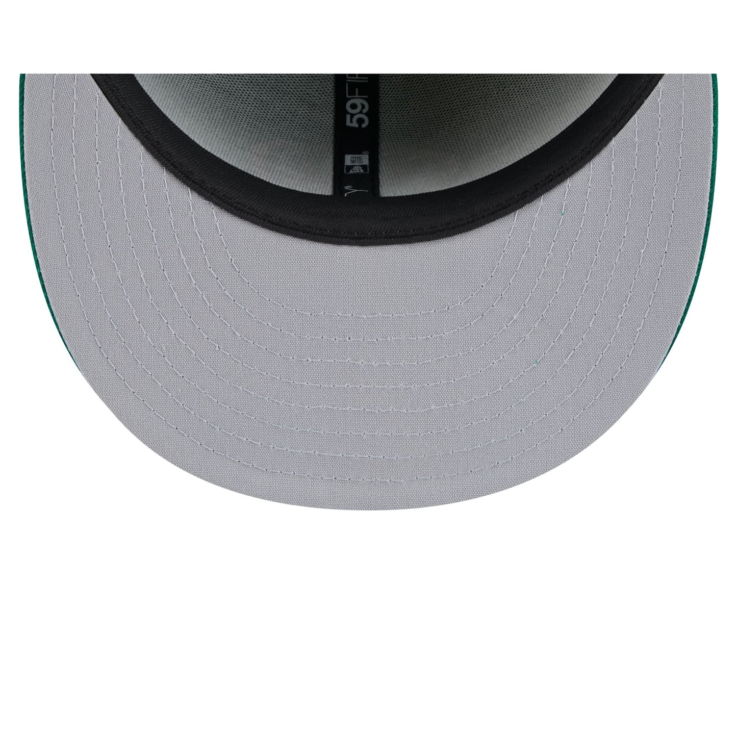 The Milwaukee Brewers St. Patrick's Day 2025 59FIFTY Fitted Cap features an embroidered Brewers logo at the front panels with a matching MLB Batterman logo at the rear. Additional details include a four-leaf clover pattern throughout the cap and a gray undervisor.