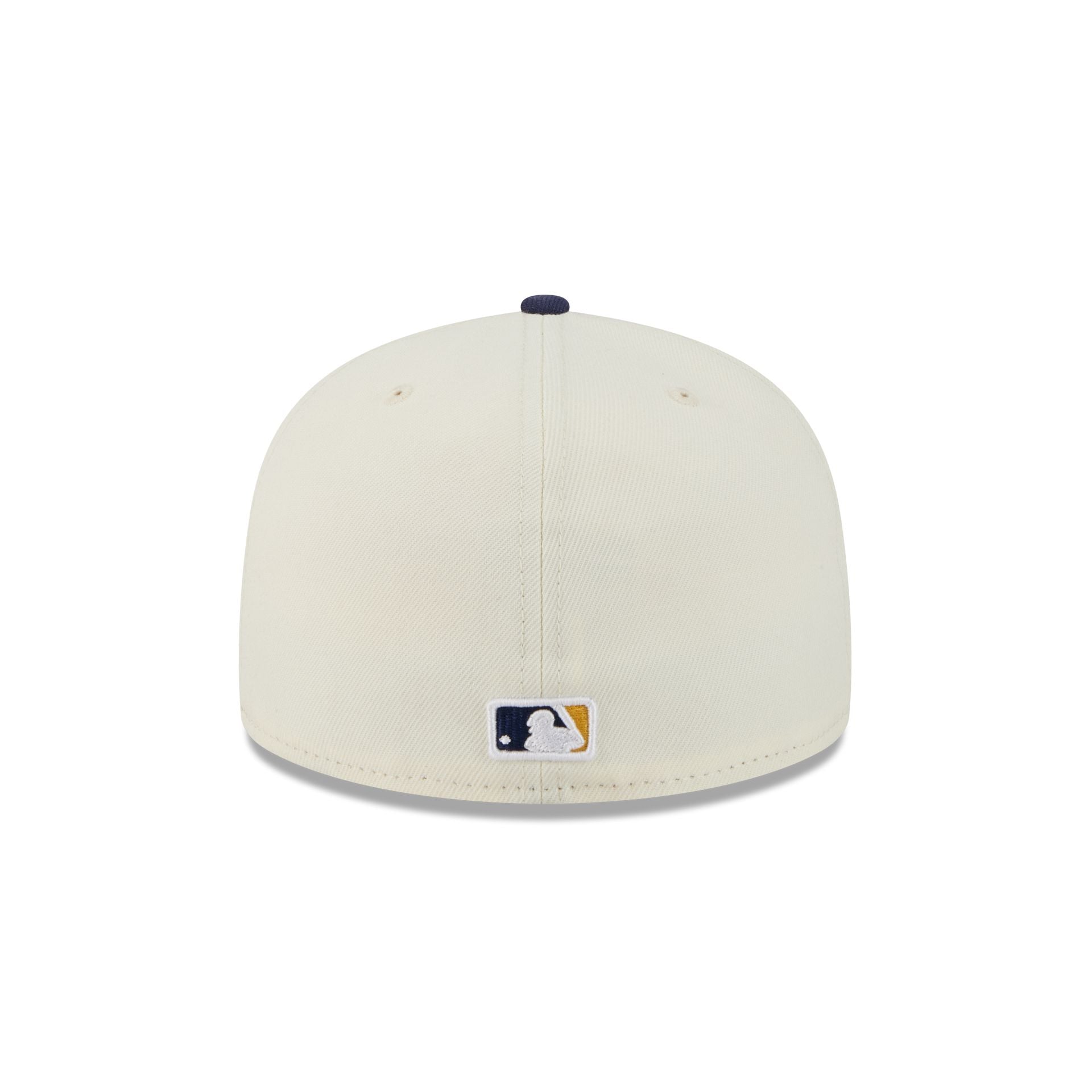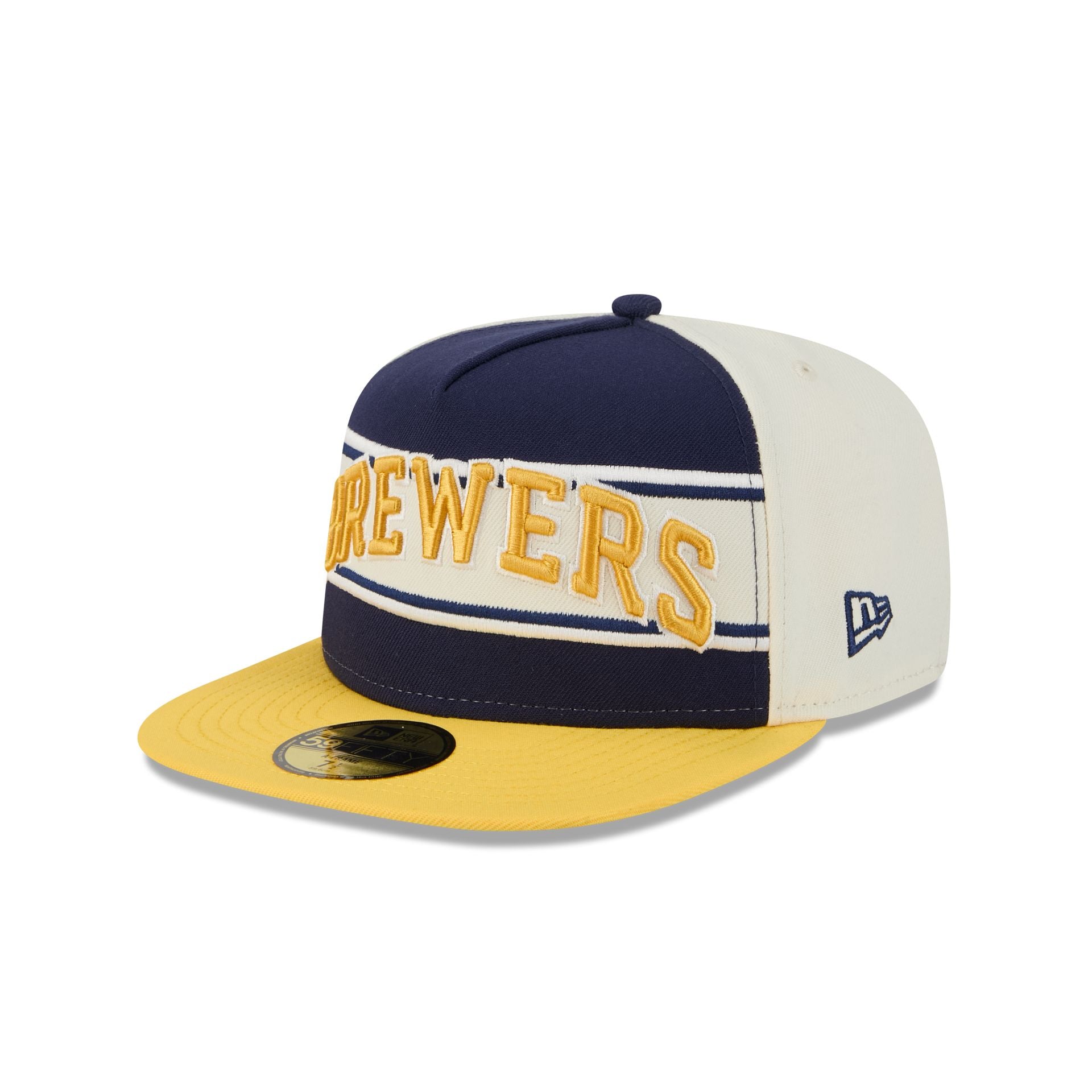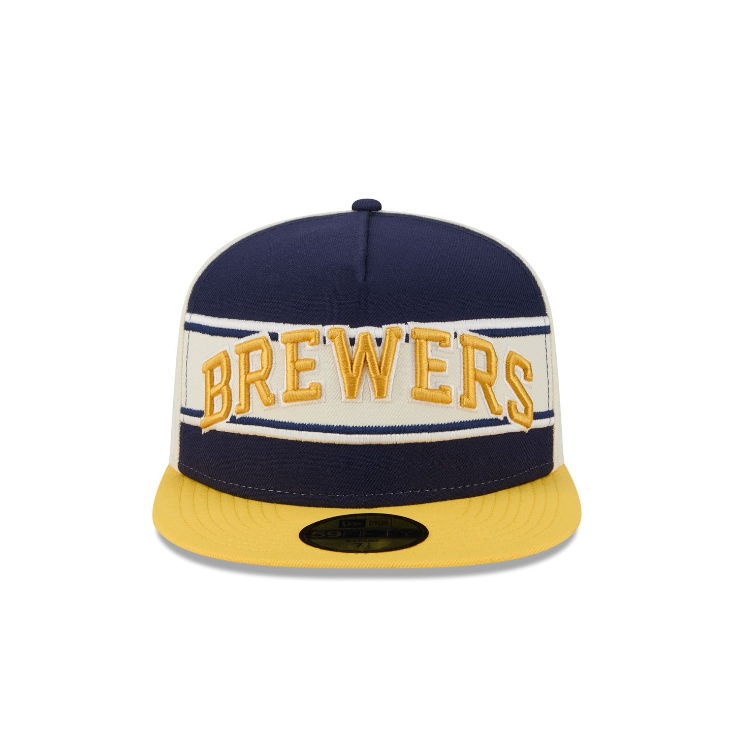 The Milwaukee Brewers Summer Derby 59FIFTY A-Frame Fitted Cap features an embroidered Brewers wordmark over team color stripes at the front panels with a matching MLB Batterman logo at the rear. Additional details include a 2002 All-Star Game patch at the right-wear side, a yellow visor, and a green undervisor.