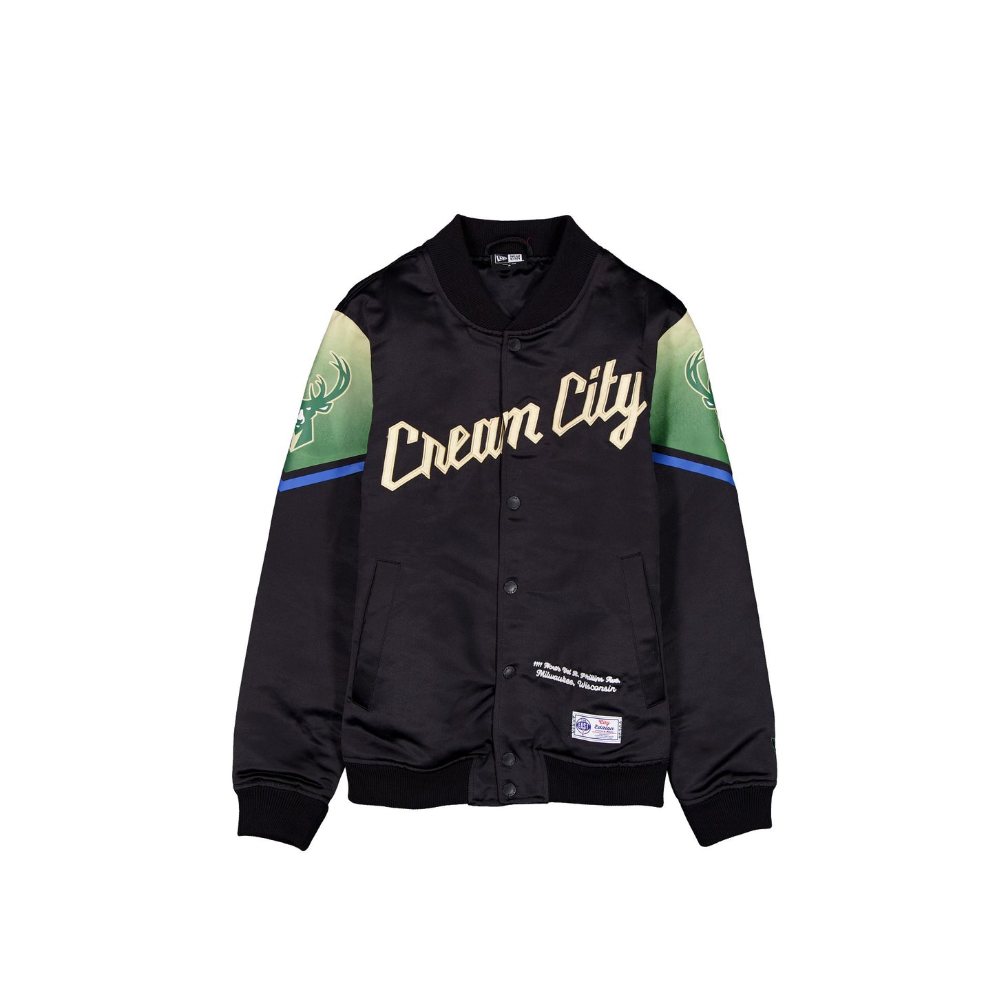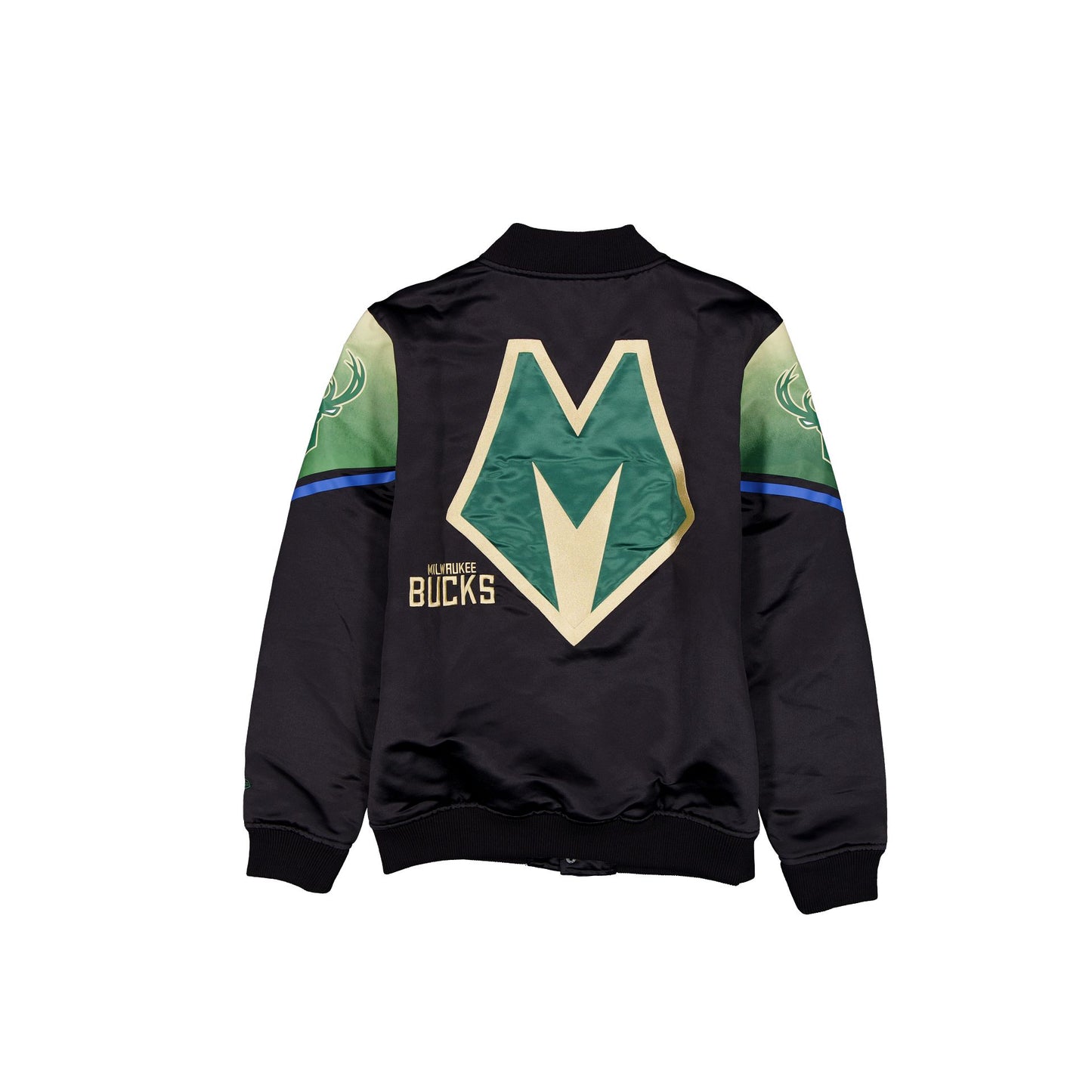 The Milwaukee Bucks 2025 City Edition Black Jacket features an embroidered Bucks City Edition wordmark at the front with an embroidered script arena address and woven City Edition jock tag at the left hip. Additional details include an applique graphic at the rear, a satin fabrication throughout, and a snap-button closure with front pockets.