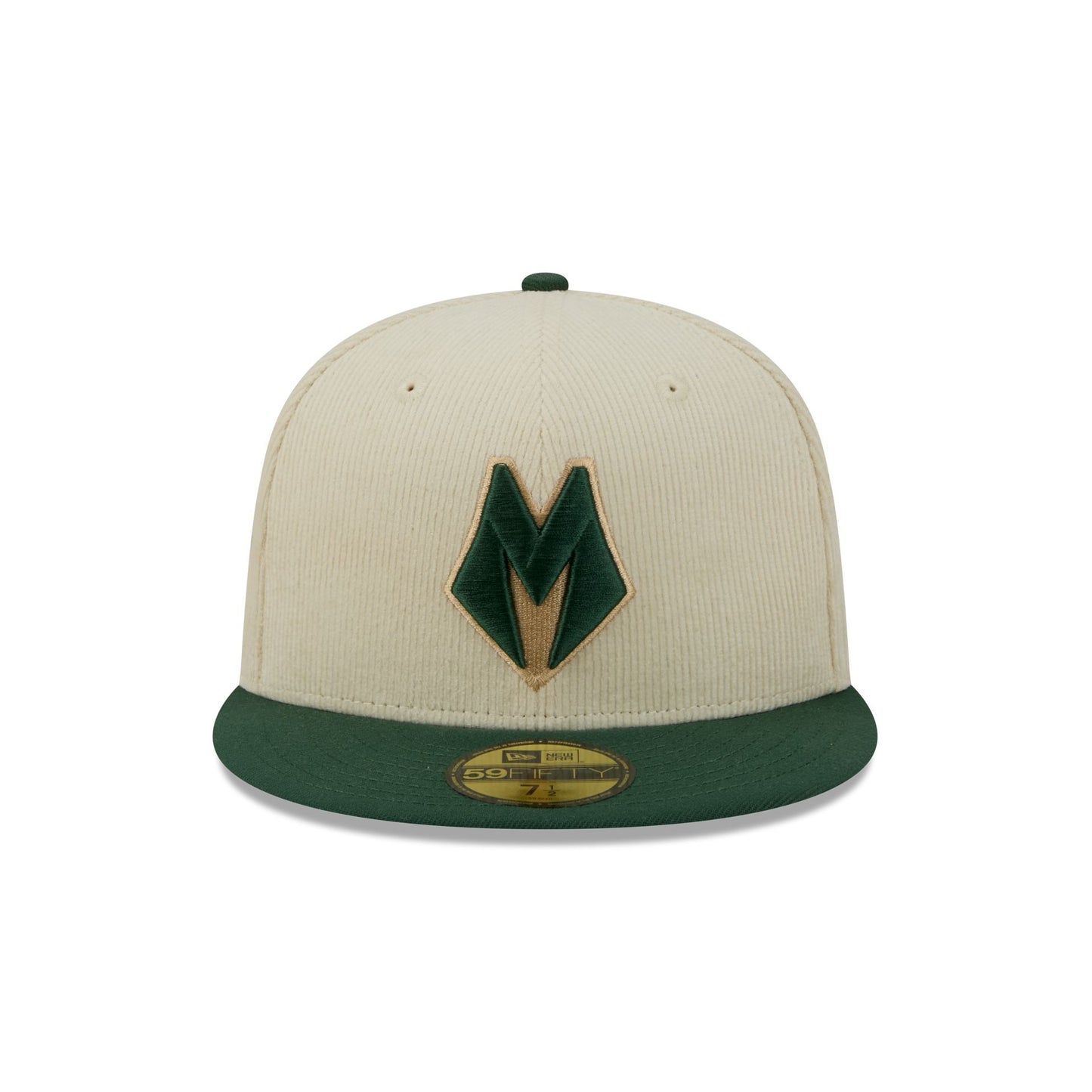 The Milwaukee Bucks 2025 City Edition Chrome White Corduroy 59FIFTY Fitted Cap features an embroidered Bucks City Edition logo at the front panels with a City Edition jock tag stitched at the right-wear side. Additional details include a corduroy fabrication, the NBA Logoman at the rear, and a gray undervisor.