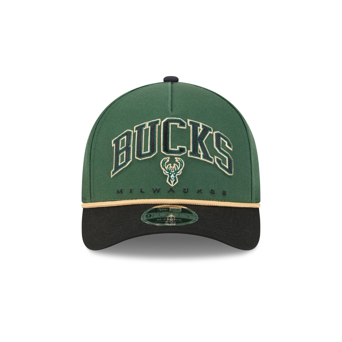 The Milwaukee Bucks Arch 9FORTY M-Crown A-Frame Snapback features an embroidered Bucks graphic at the front panels with a rope at the visor. Additional details include an adjustable snapback closure at the rear with a gray undervisor.