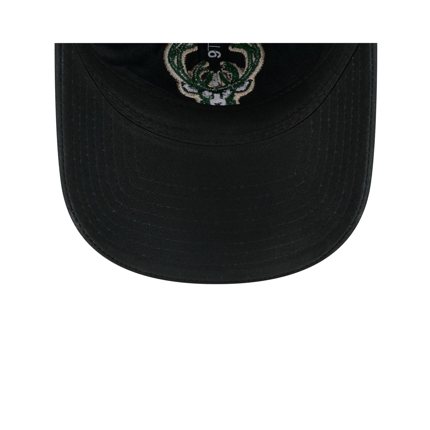 The Milwaukee Bucks Black 9TWENTY Adjustable Cap features an embroidered Bucks logo at the front panels with a matching woven team logo tag at the adjustable D-Ring closure at the rear.