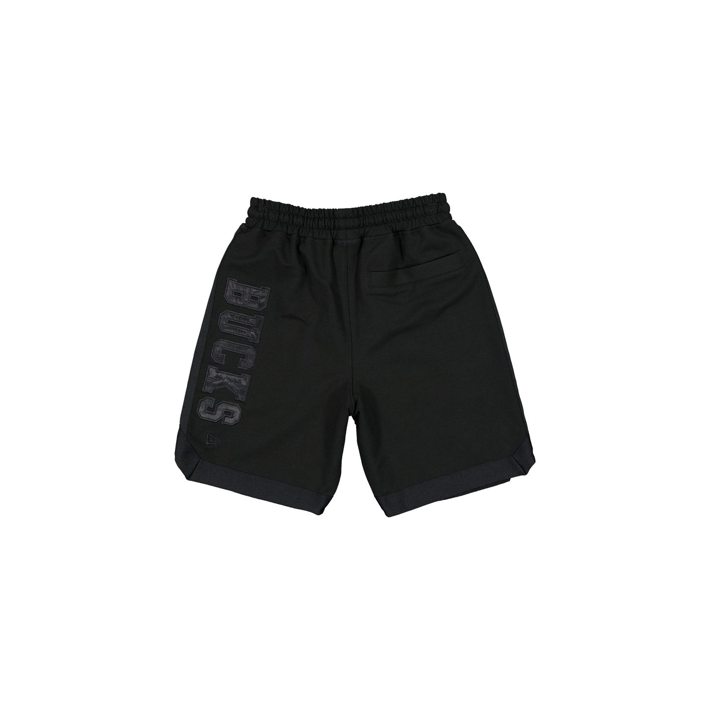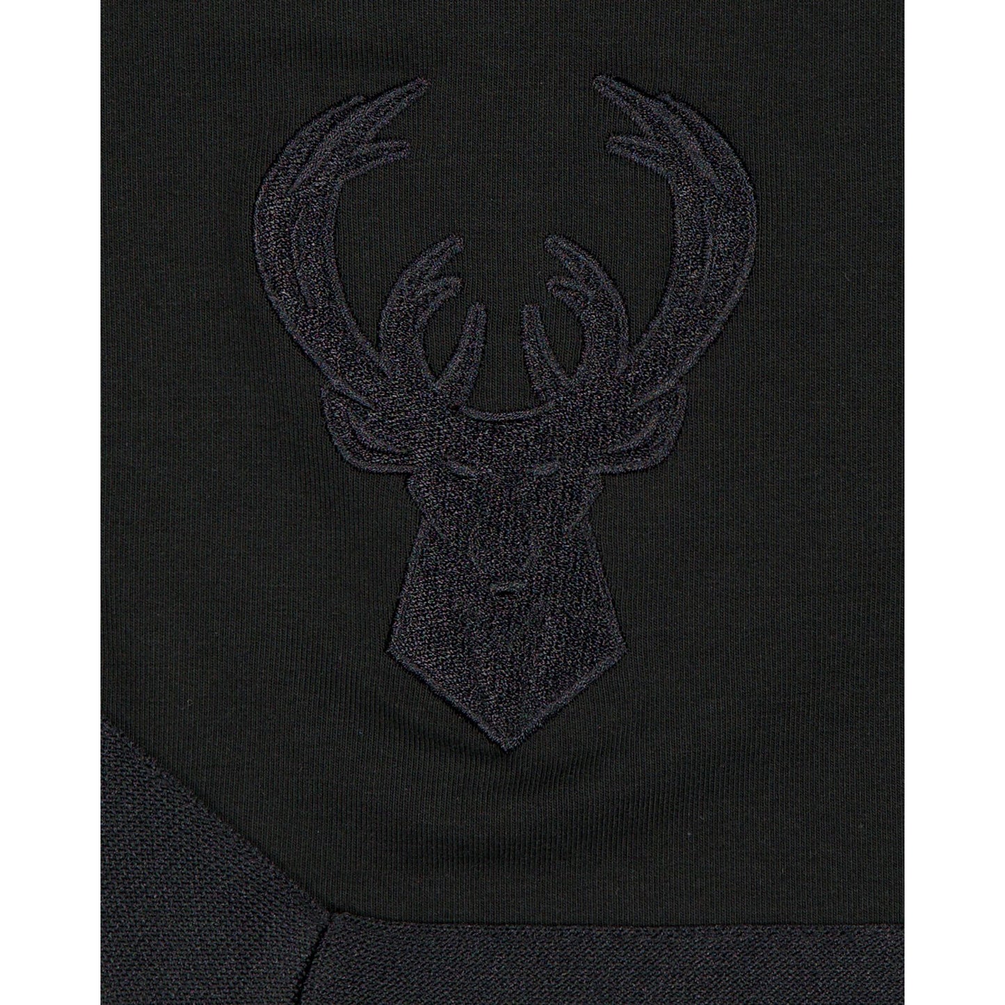 The Milwaukee Bucks Black on Black Logo Select Shorts features an embroidered Bucks logo at the right-wear leg and a satin applique with a tonal stitch team wordmark at the rear left leg.