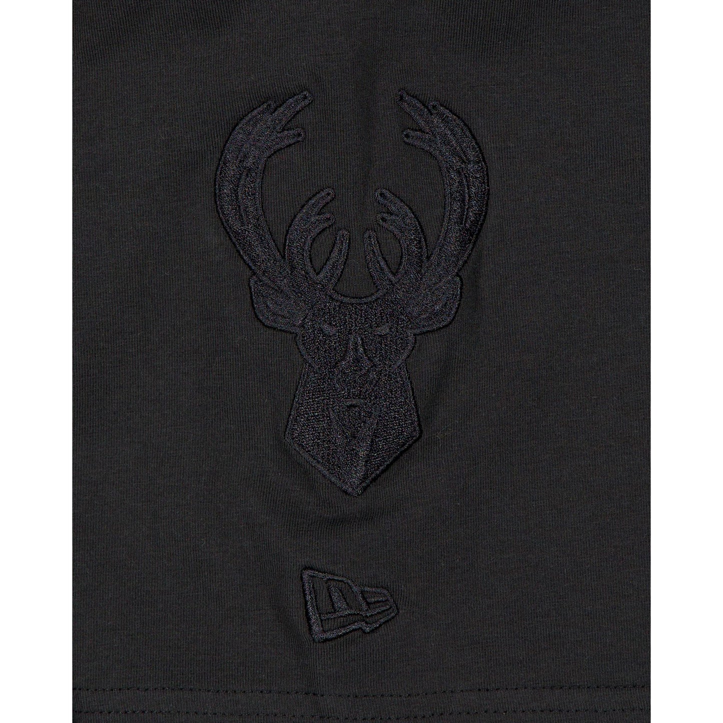 The Milwaukee Bucks Black on Black Logo Select T-Shirt features a satin applique with a tonal stitch Bucks wordmark at the chest and an embroidered team logo at the left-wear sleeve.