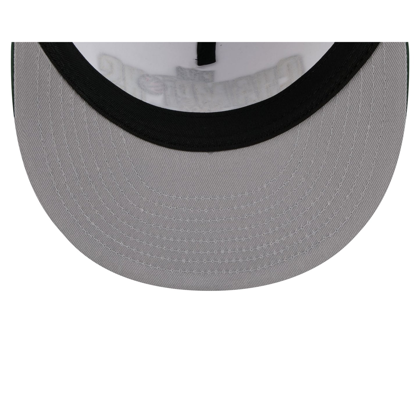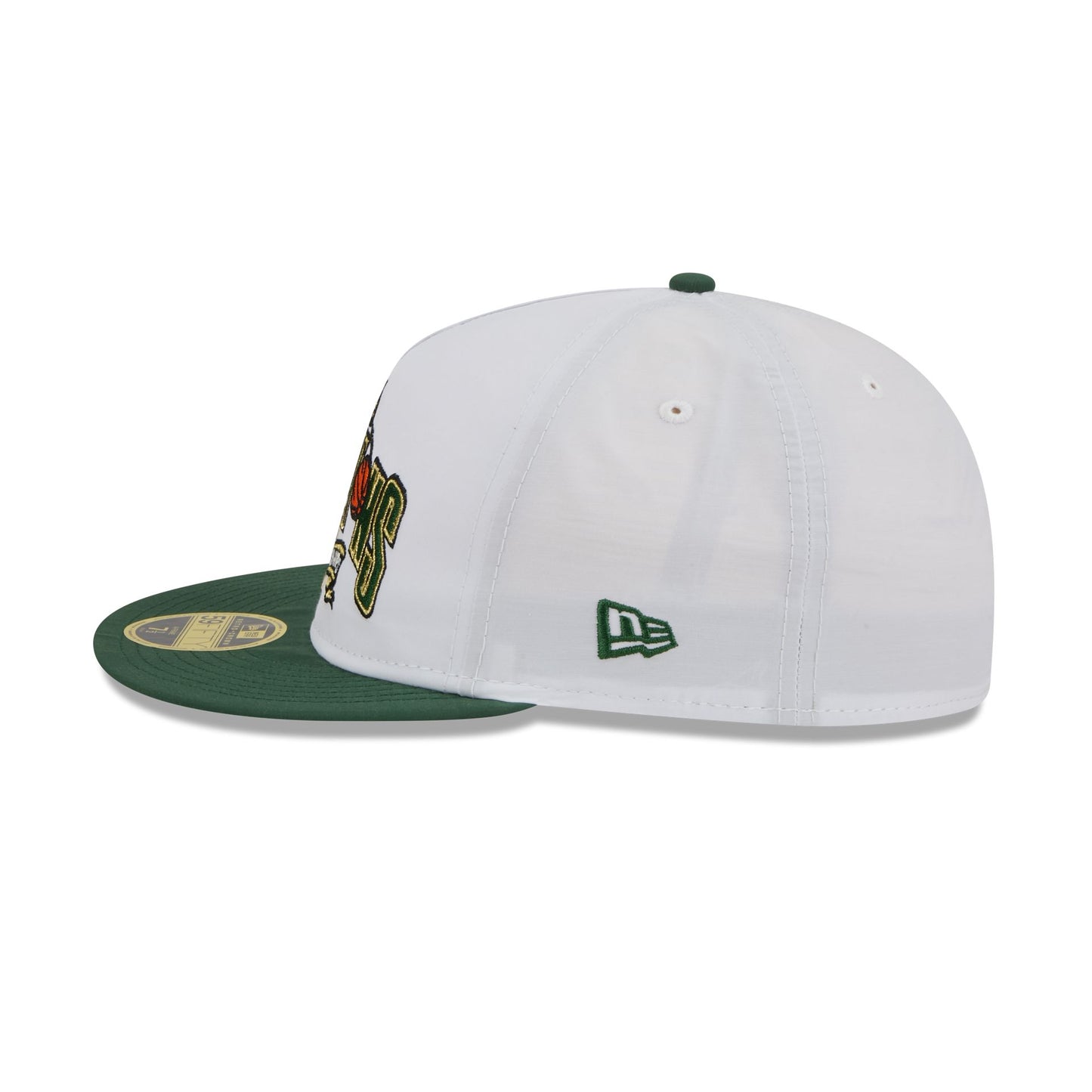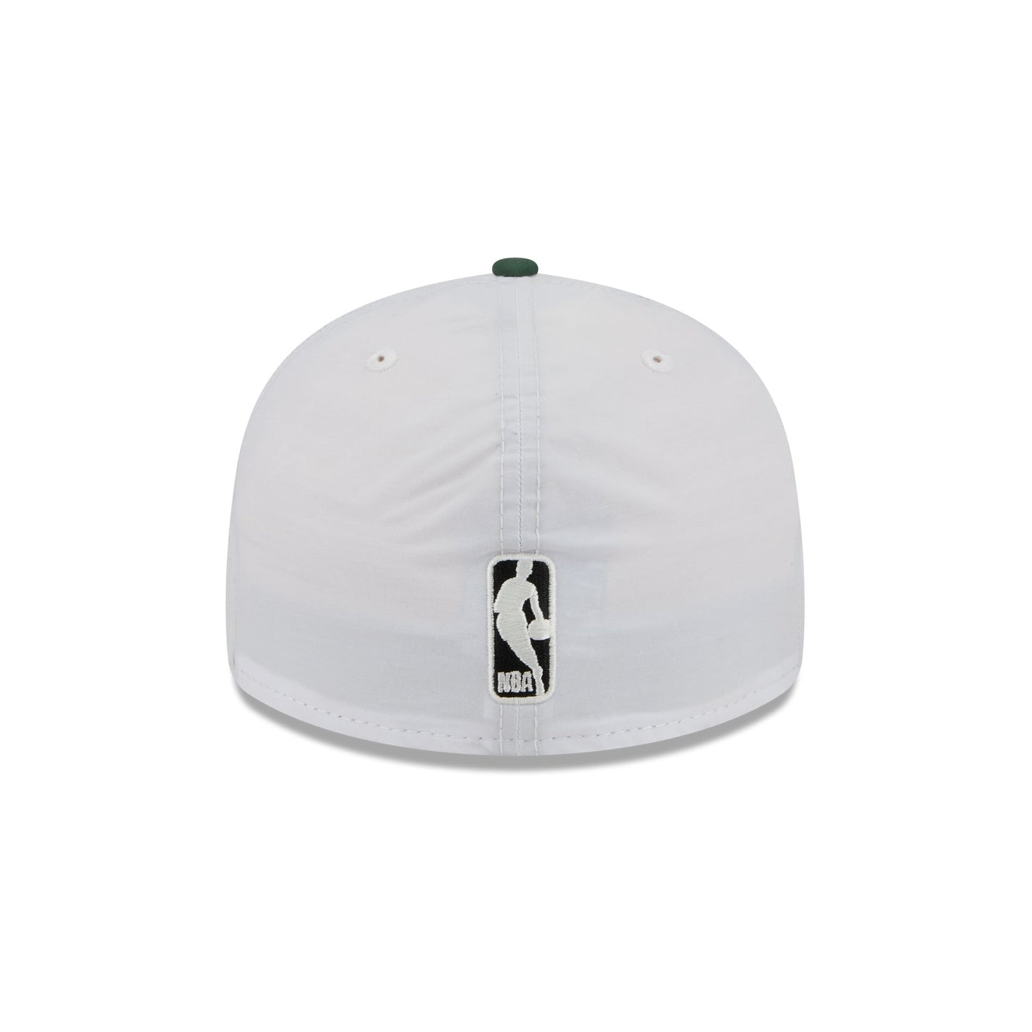The Milwaukee Bucks Champions White Retro Crown 59FIFTY Fitted Cap features an embroidered Bucks Champions graphic at the front panels with the NBA Logoman at the rear and a gray undervisor.