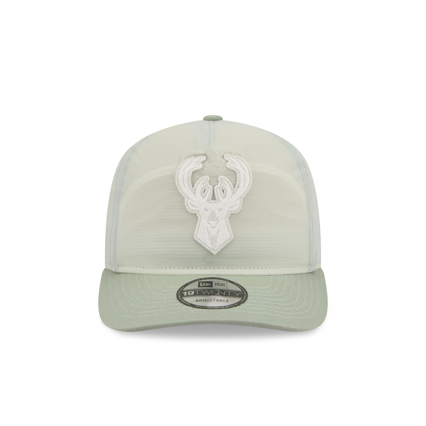 The Milwaukee Bucks Crinkle 19TWENTY Adjustable Cap features an embroidered Bucks logo at the front panels with a nylon fabrication throughout. Additional details include the NBA Logoman above an adjustable snapback closure at the rear and a green undervisor.