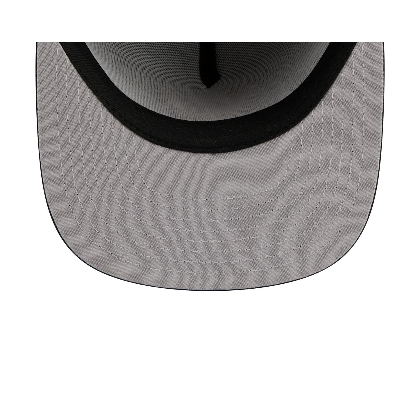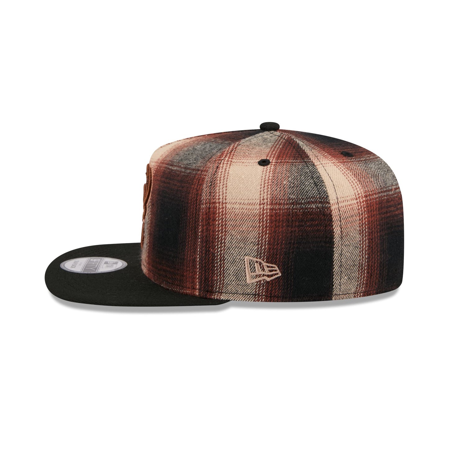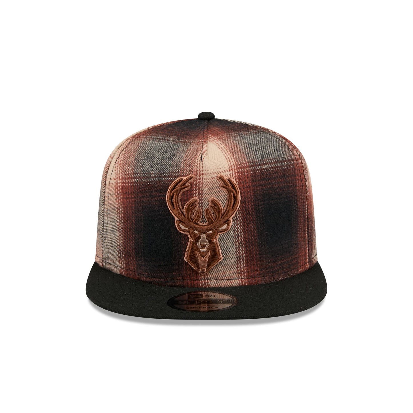 The Milwaukee Bucks Grunge Plaid 9FIFTY A-Frame Adjustable Cap features an embroidered Bucks logo at the front panel with a matching wordmark above an adjustable metal clasp closure at the rear, a black visor, and a gray undervisor.
