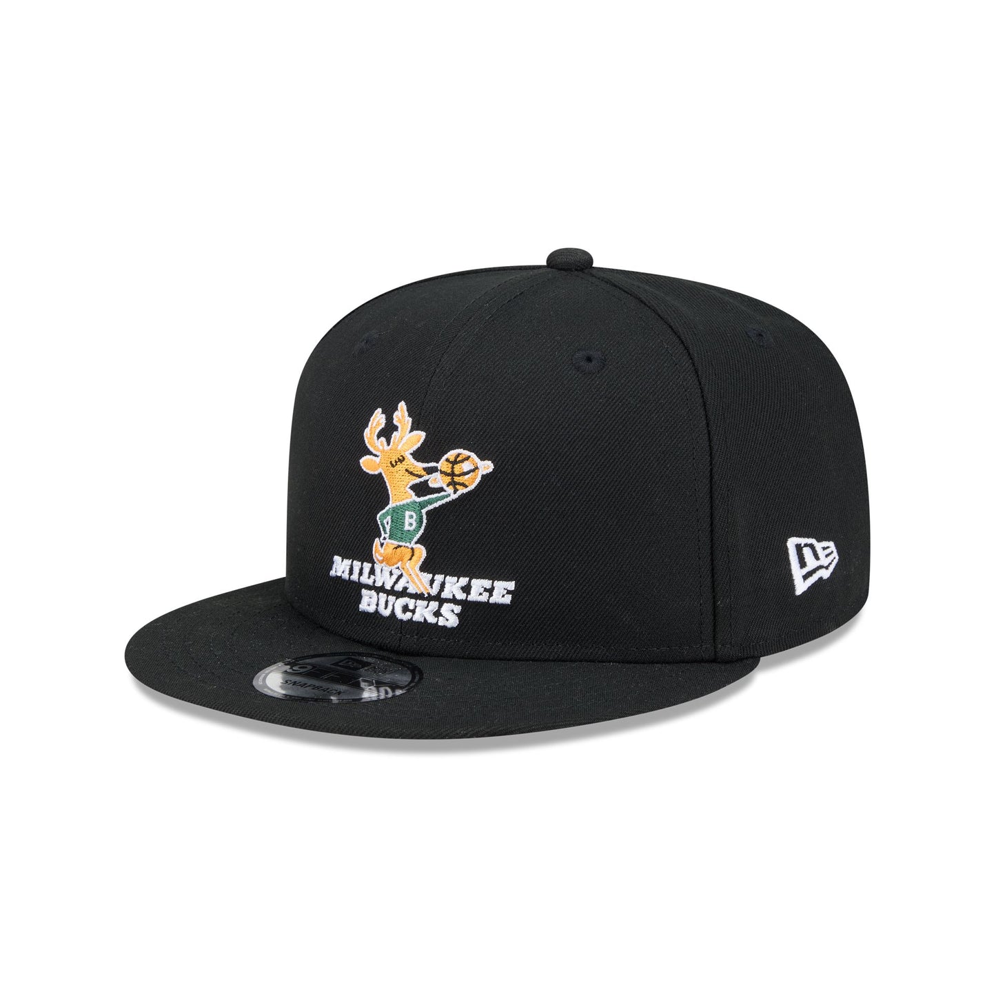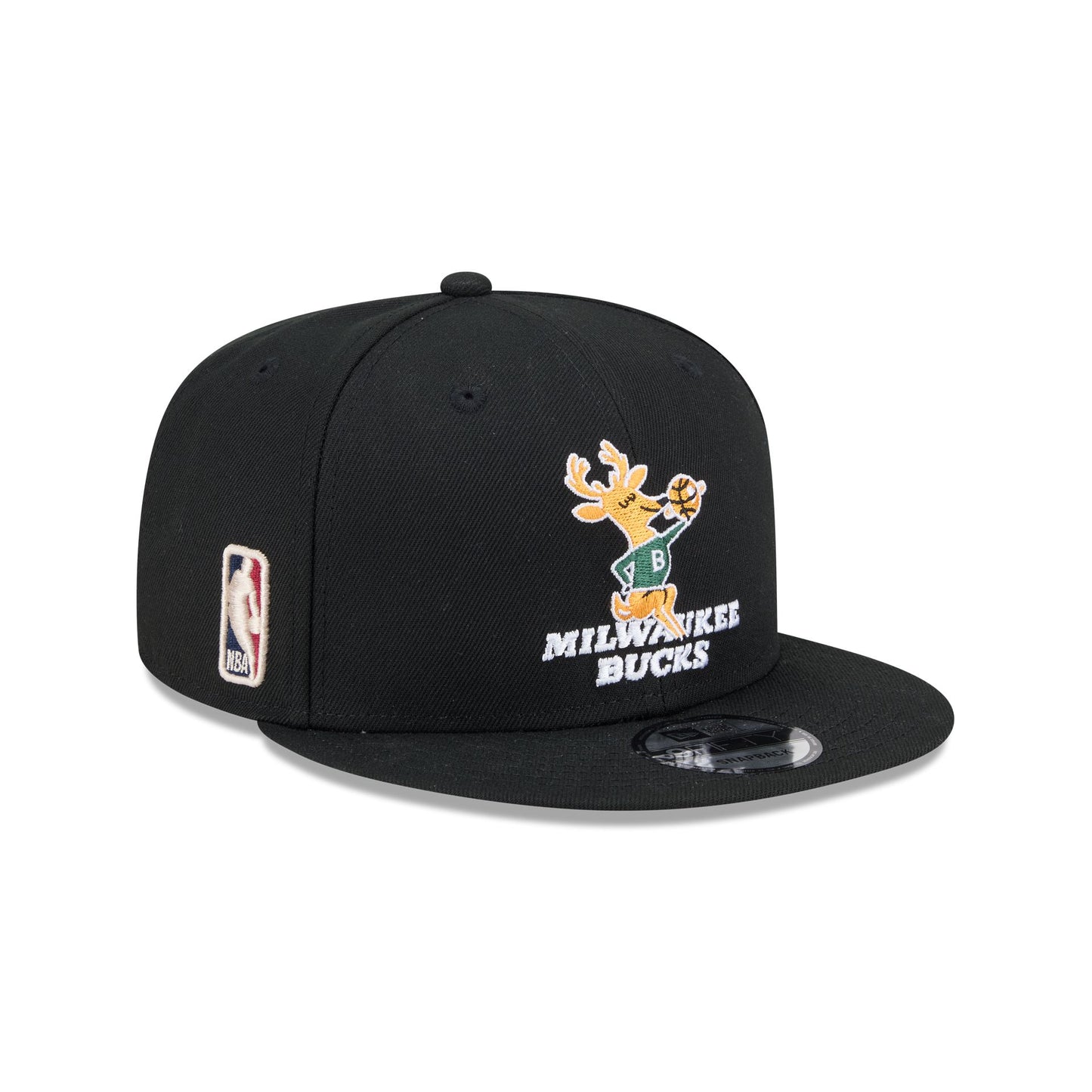 The Milwaukee Bucks 1968-1992 Hardwood Classics 9FIFTY Snapback features an embroidered vintage Bucks logo at the front panels with the NBA Logoman at the right-wear side. Additional details include an adjustable snapback closure at the rear and a gray undervisor.