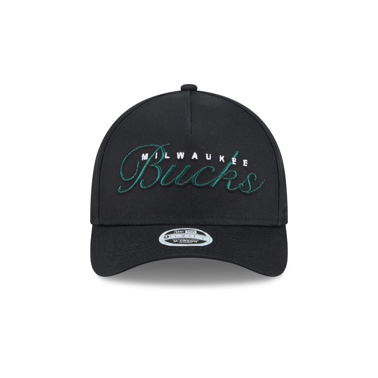 The Milwaukee Bucks Metallic Women's 9FORTY M-Crown A-Frame Snapback features an embroidered Bucks metallic script wordmark at the front panel with a snapback closure at the rear and a satin undervisor.
