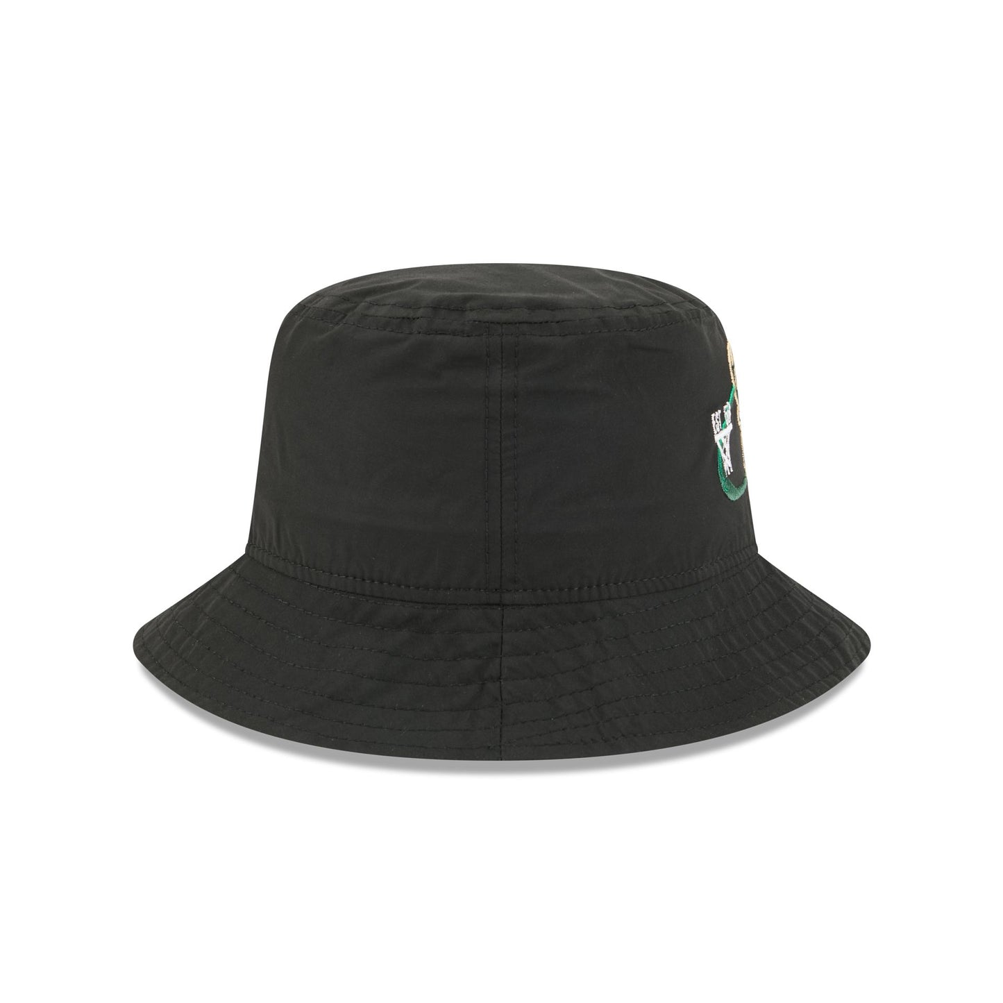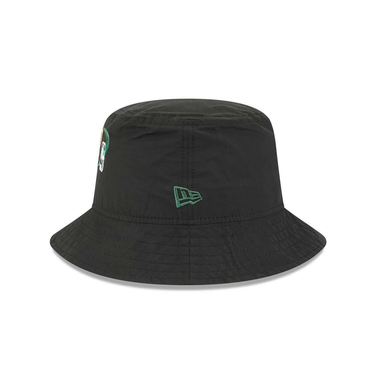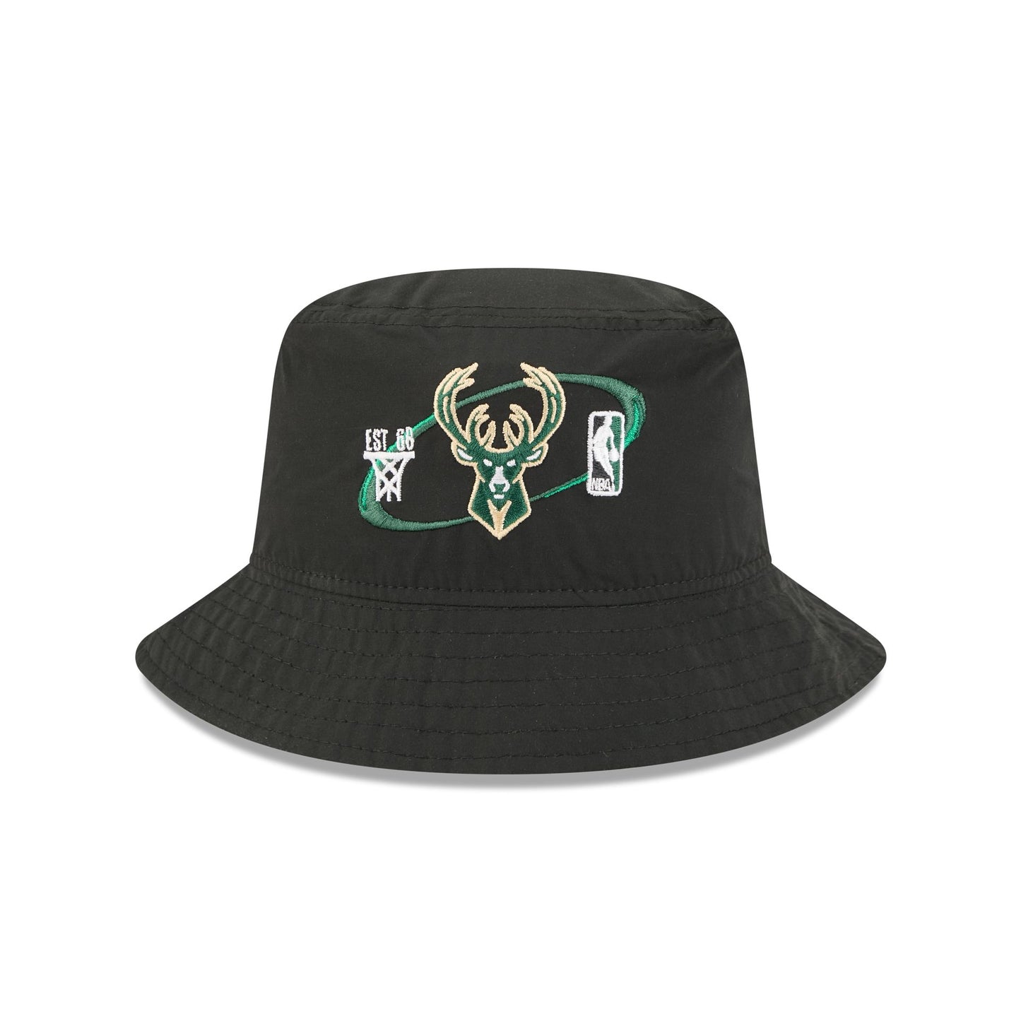 The Milwaukee Bucks Nylon Logo Bucket Hat features an embroidered Bucks logo, establishment date, and NBA Logoman at the front.