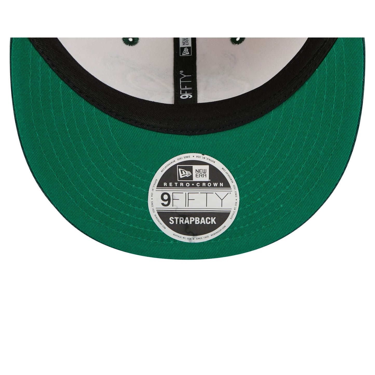 The Milwaukee Bucks Pinstripe Script Retro Crown 9FIFTY Adjustable Cap features an embroidered Bucks logo and cursive wordmark at the front panels wit an adjustable belt closure at the rear and a green undervisor.