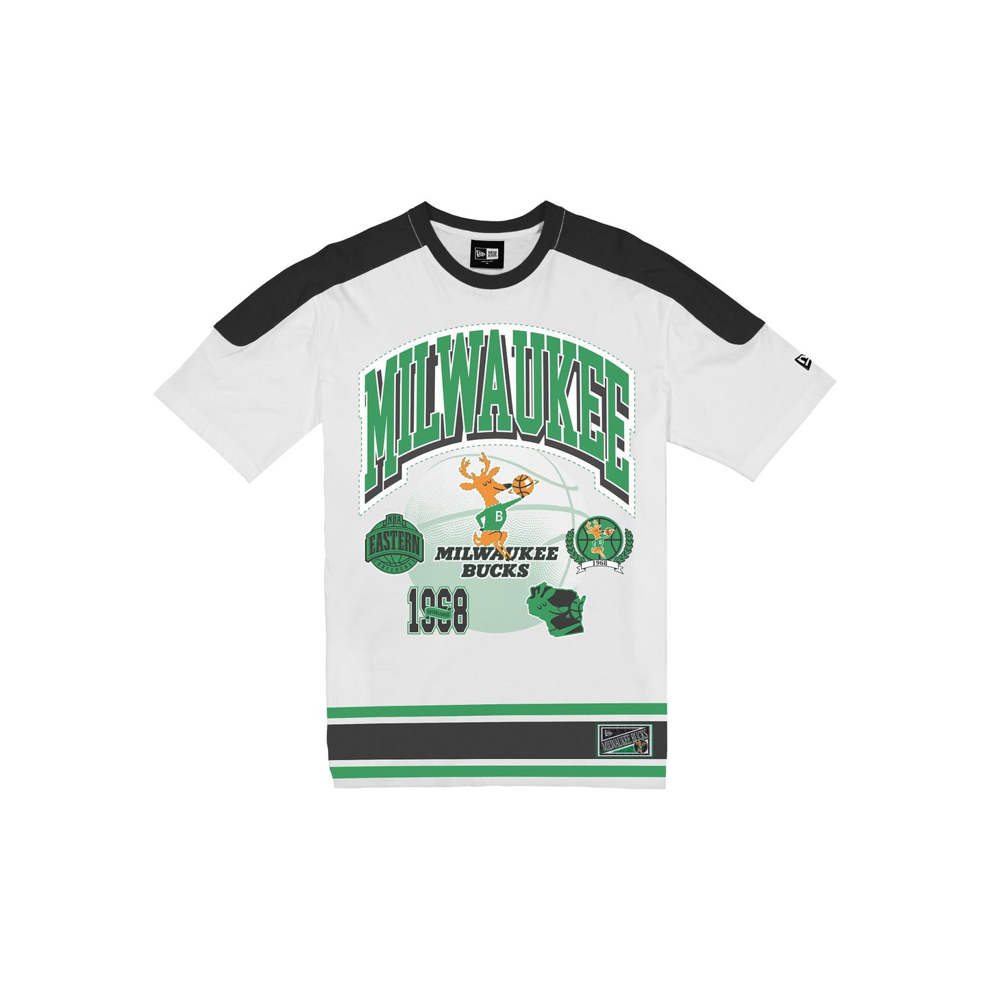 The Milwaukee Bucks Sport Classics Vintage White Oversized T-Shirt features a screen-printed Bucks wordmark and graphic at the front with woven team jocktag at the bottom hem. Additional details include team color stripes at the shoulders and hem with a team wordmark above a '68 established year jersey number at the rear.