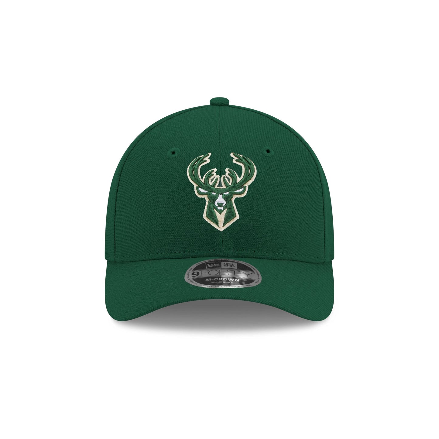 The Milwaukee Bucks Team 9FORTY M-Crown Snapback features an embroidered Bucks logo at the front panels with the NBA Logoman above an adjustable snapback closure at the rear and a gray undervisor.