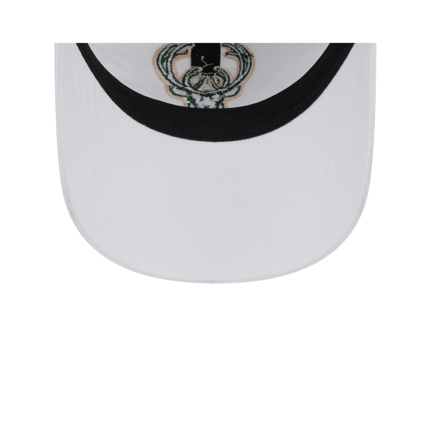 The Milwaukee Bucks White 9TWENTY Adjustable Cap features an embroidered Bucks logo at the front panels with a matching woven team logo tag at the adjustable D-Ring closure at the rear.