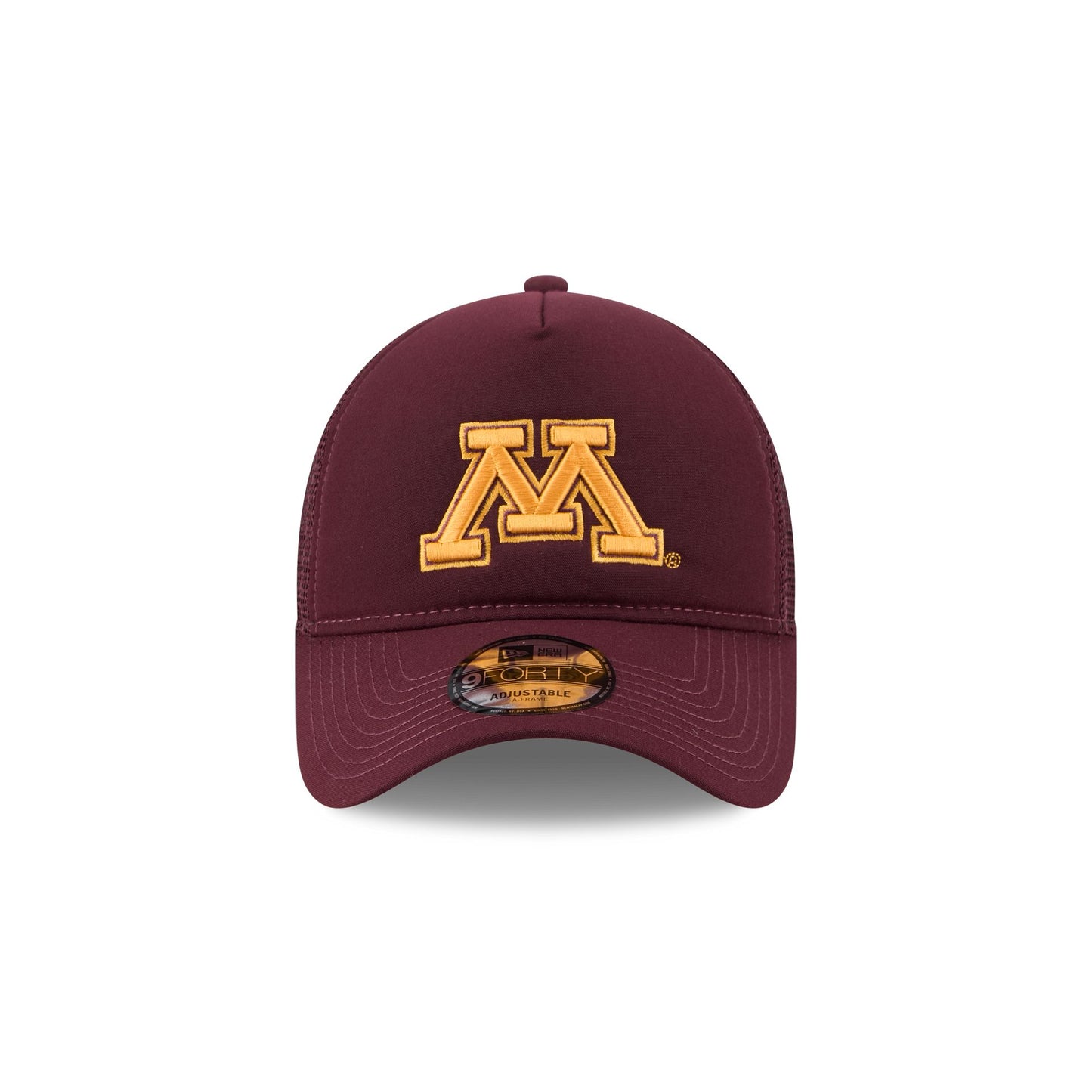 The Minnesota Golden Gophers Go-To 9FORTY A-Frame Trucker features an embroidered Golden Gophers logo at the front panels with a snapback closure at a mesh rear.