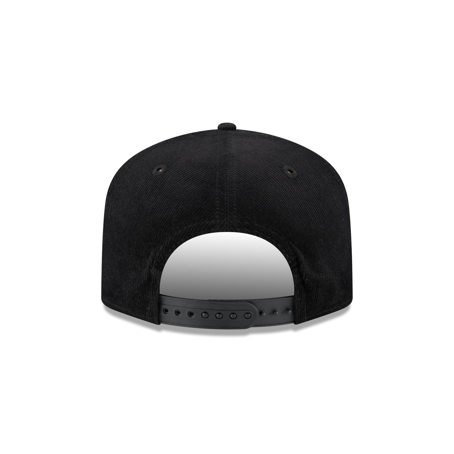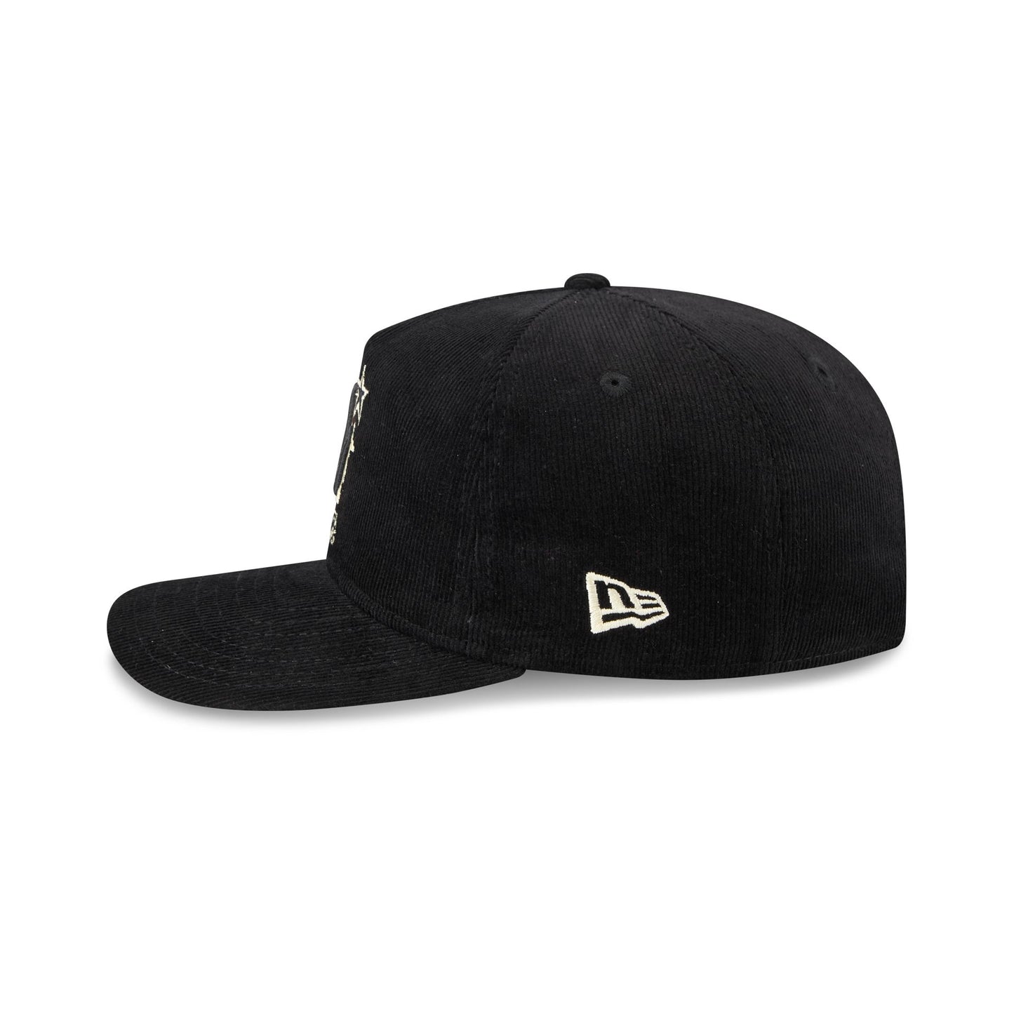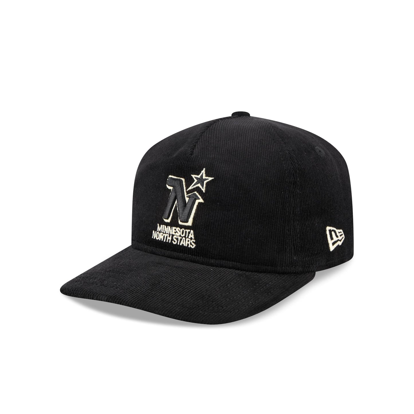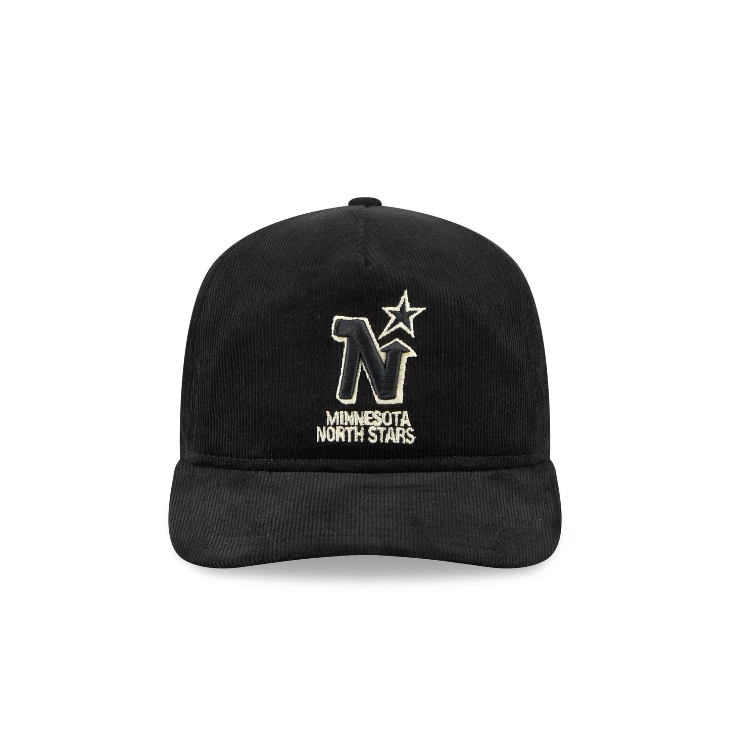 The Minnesota North Stars Nostalgic Black Corduroy 19TWENTY Adjustable Cap features an embroidered North Stars Vintage logo at the front panel with a snapback closure at the rear and a gray undervisor.