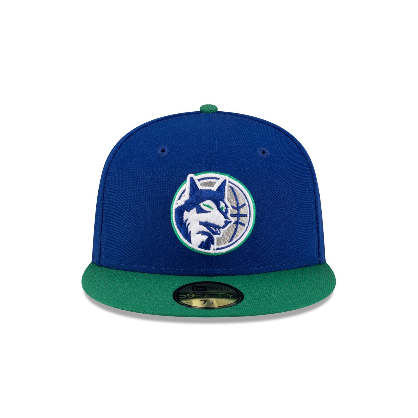 The Minnesota Timberwolves 1989-1996 Hardwood Classics Express 59FIFTY Fitted Cap features an embroidered Timberwolves 1989-1996 Hardwood Classics logo at the front panels with a circle patch at the right-wear side. Additional details include the NBA Logoman at the rear and a gray undervisor.