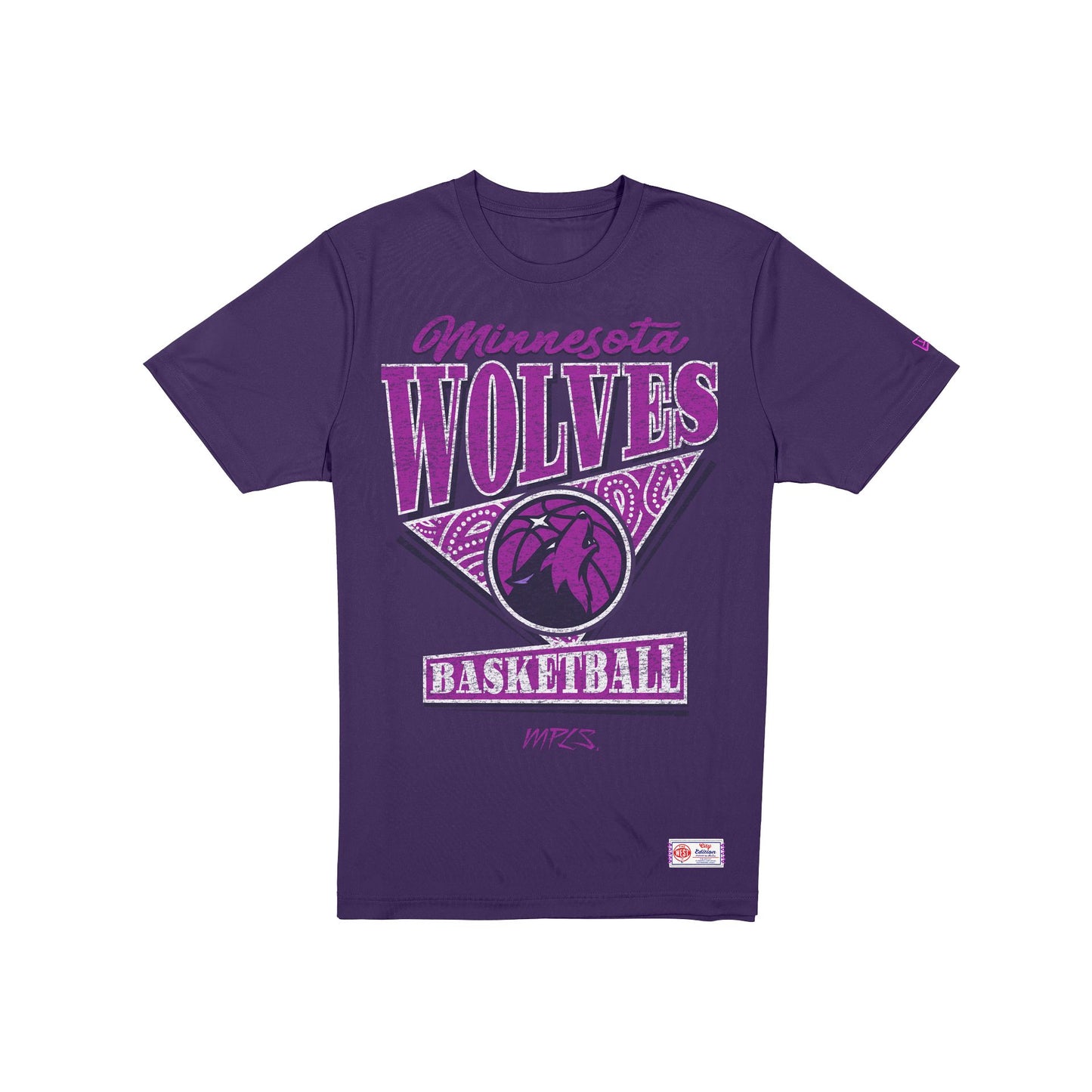 The Minnesota Timberwolves 2025 City Edition T-Shirt features a screen-printed Timberwolves City Edition graphic at the front with a City Edition jock tag at the left hip.