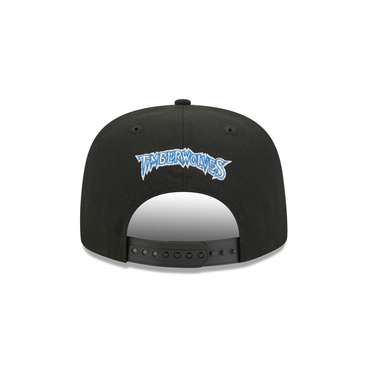 The Minnesota Timberwolves 2025 Classic Edition 9FIFTY A-Frame Snapback features an embroidered Timberwolves logo at the front panel with a matching team wordmark above a snapback closure at the rear. Additional details include an NBA Logoman patch at the right-wear side with a gray undervisor.