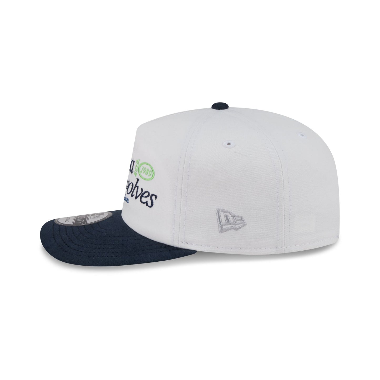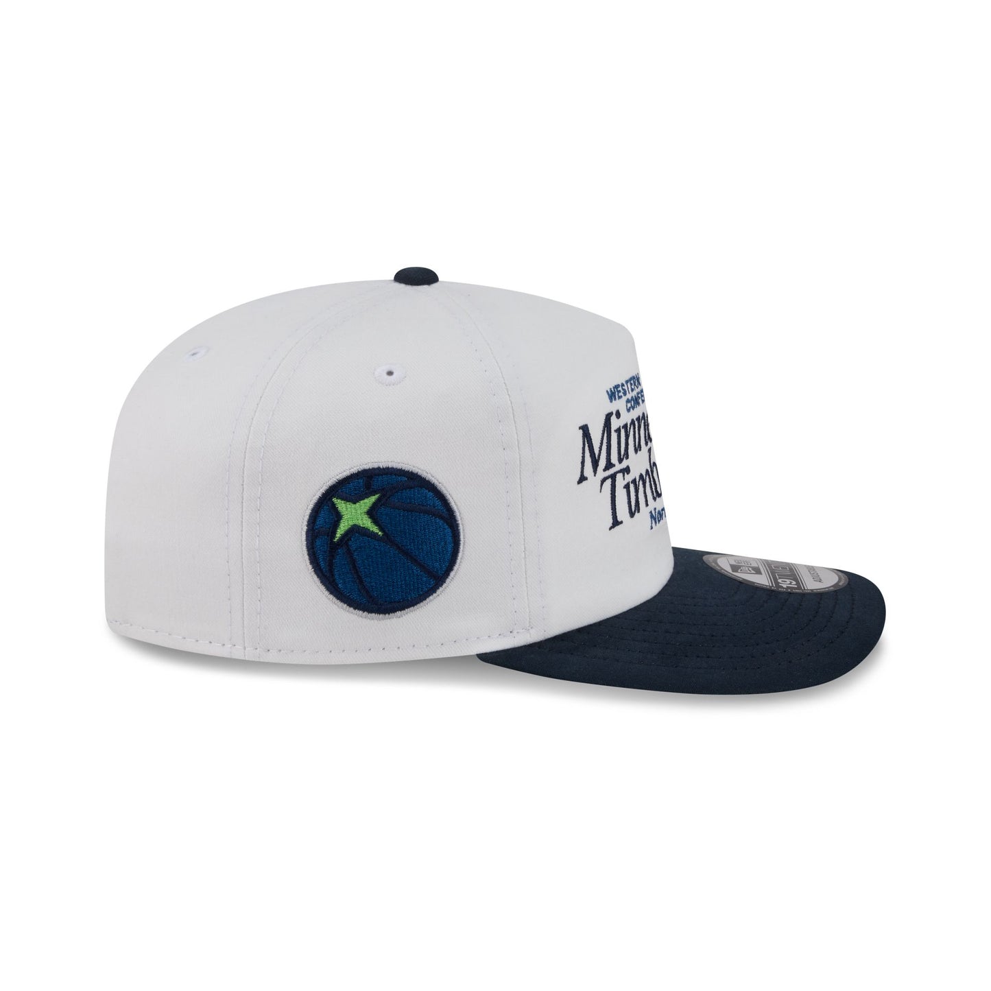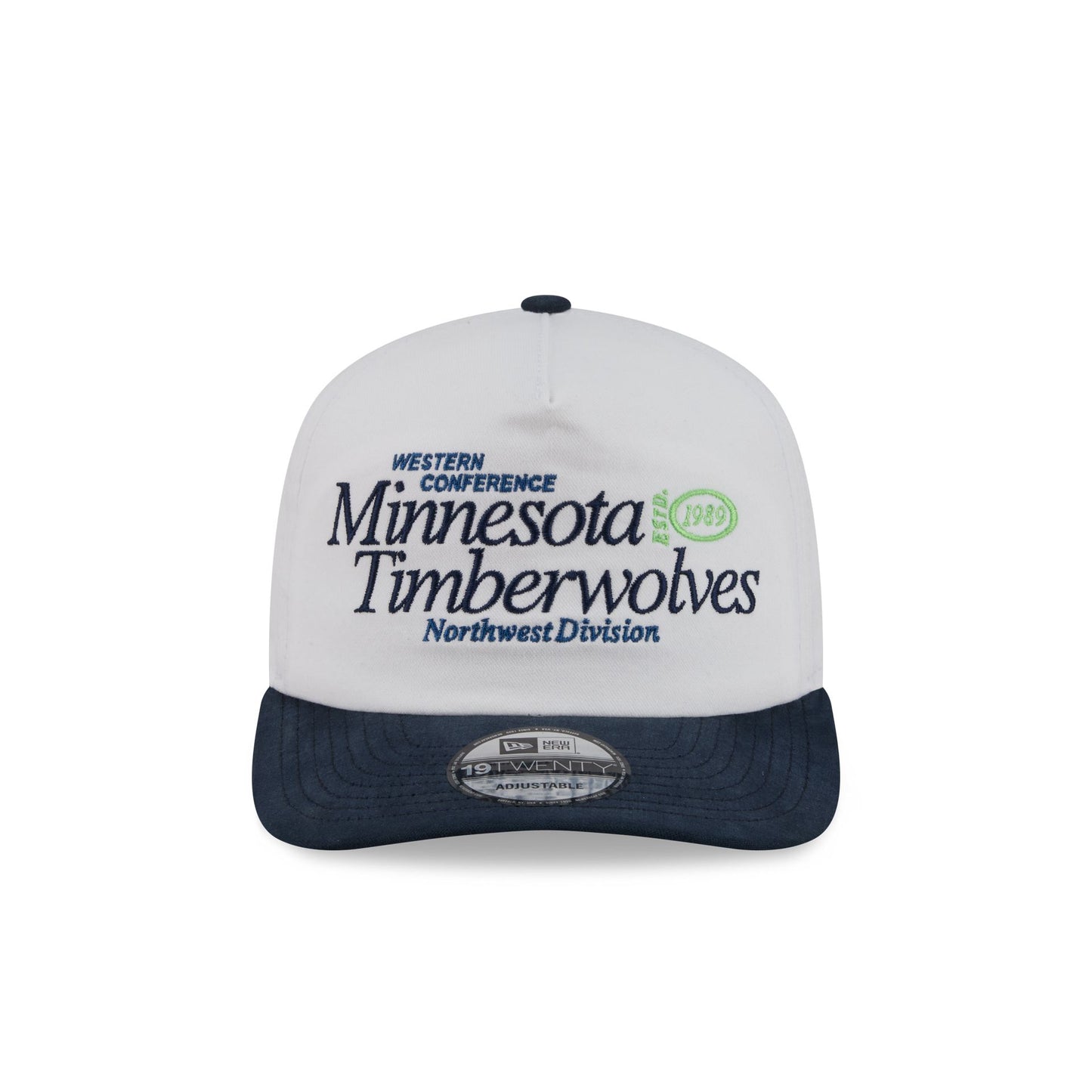 The Minnesota Timberwolves Conference Script 19TWENTY Snapback features an embroidered Western Conference script above a Timberwolves Northwest Division wordmark at the front panel. Additional details include a team logo at the right-wear side with an adjustable snapback closure at the rear and a green undervisor.