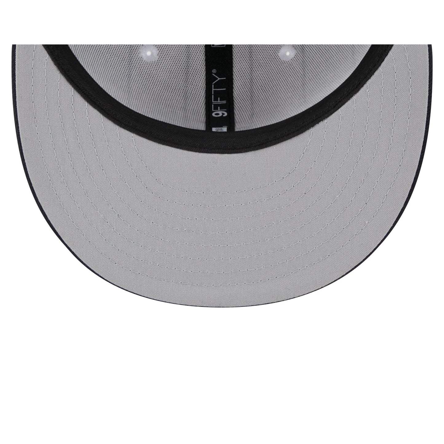 The Minnesota Twins 2025 Batting Practice 9FIFTY Snapback features an embroidered Twins logo at the pinstripe front panels with a matching snapback closure at the rear. Additional details include a pivot knit fabrication, a navy visor, and a gray undervisor.