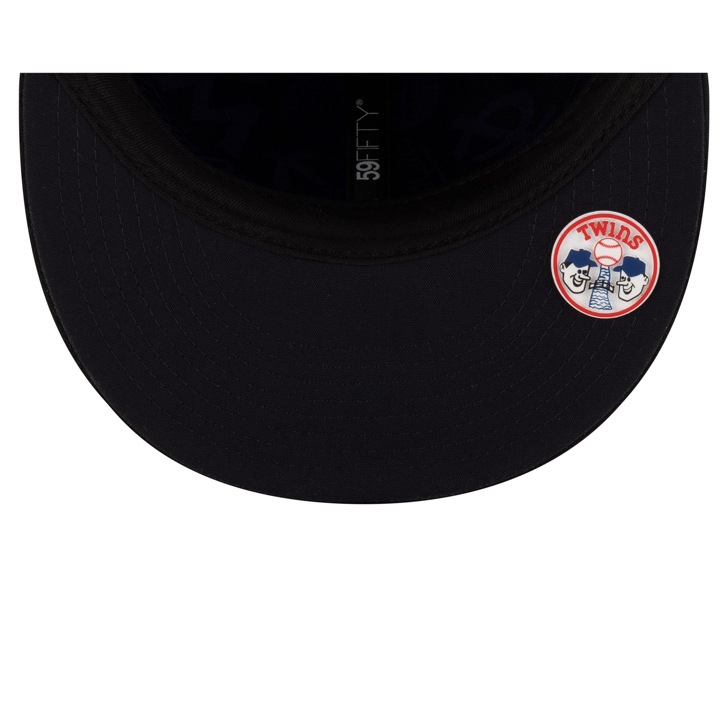 The Minnesota Twins 2025 Clubhouse Black 59FIFTY Fitted Cap features an embroidered Twins logo at the front panels with a matching MLB Batterman logo at the rear and a dashmark mesh fabrication throughout. Additional details include a silicone logo on the undervisor and a team design on the inner lining.