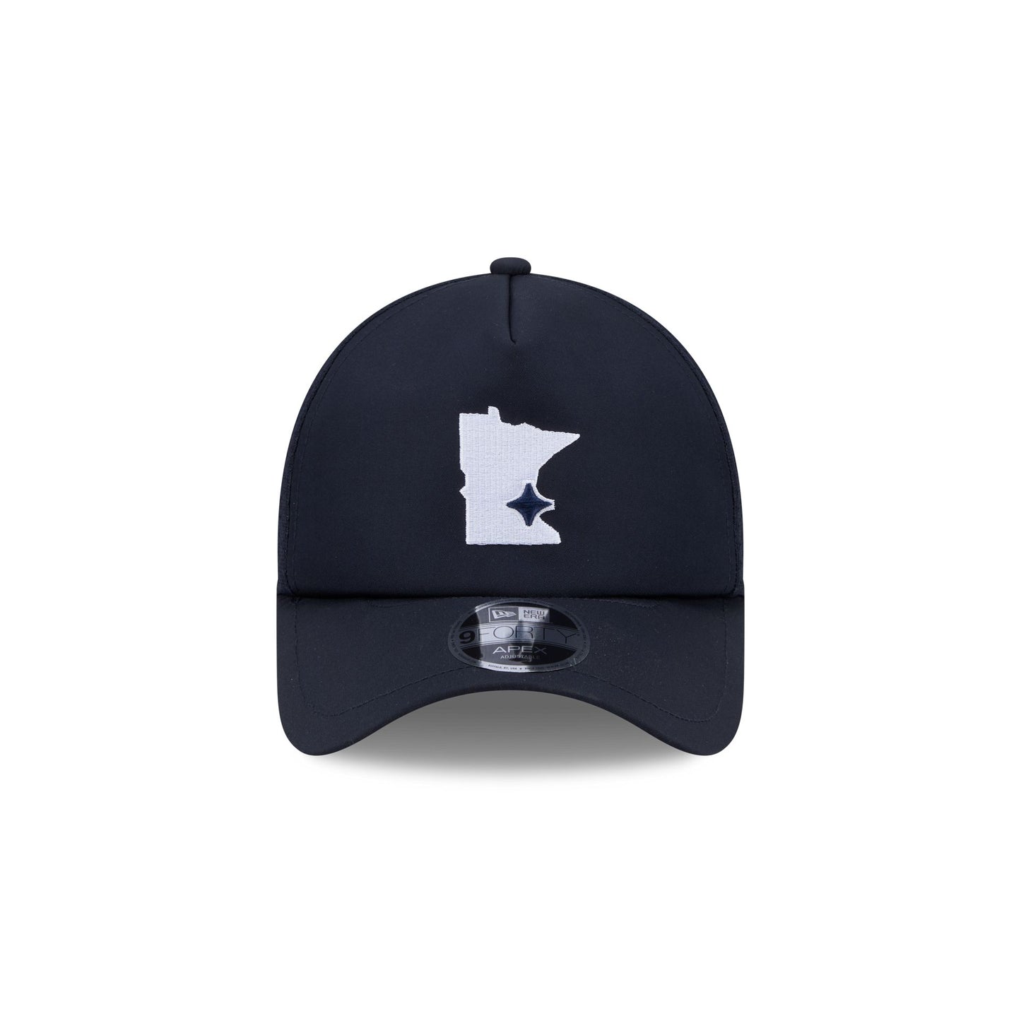 The Minnesota Twins 2026 Batting Practice Alt State 9FORTY APEX Trucker features an embroidered Twins Alternate logo at the front panel with the MLB Batterman logo on an adjustable snapback closure at a diamond mesh rear.