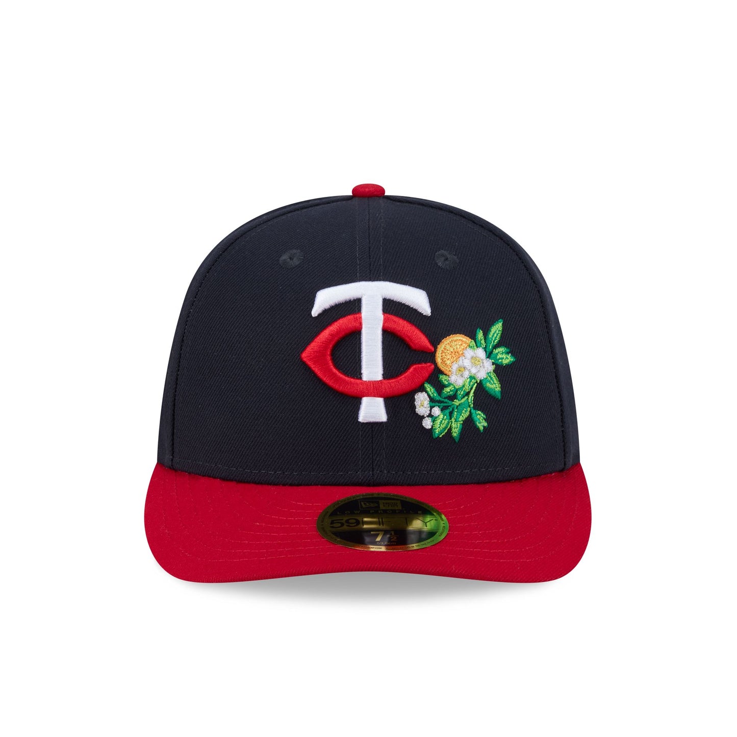 The Minnesota Twins 2026 Spring Training Low Profile 59FIFTY Fitted Cap features an embroidered floral Twins logo at the front panels with a 2026 Spring Training patch at the right-wear side and the MLB Batterman logo at the rear. Additional details include an embroidered spring training location at a gray undervisor and a floral lining. This cap comes with a pre-curved visor.