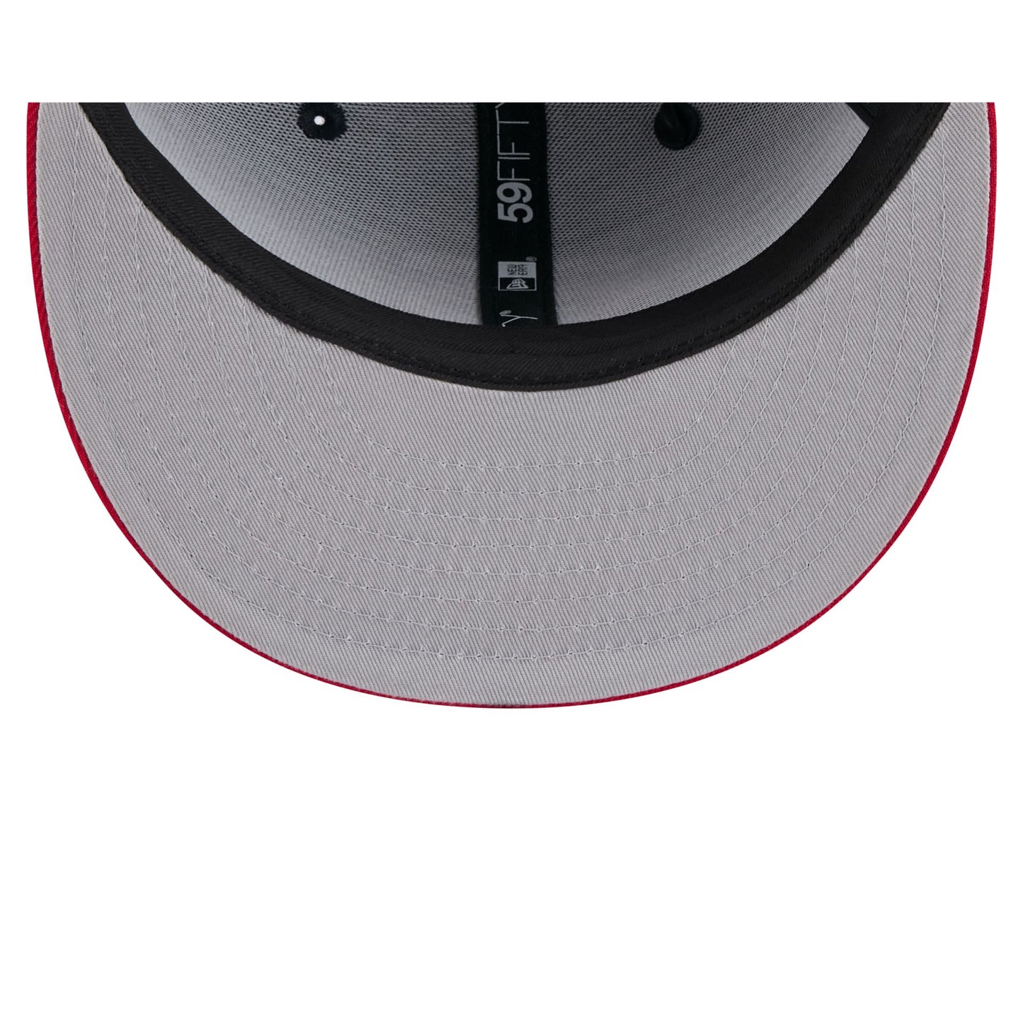 The Minnesota Twins Pinstripe League Pin 59FIFTY Fitted Cap features an embroidered Twins logo at the front panels with a League pin at the front right panel. Additional details include pinstripes, a matching MLB Batterman logo at the rear, and a gray undervisor.