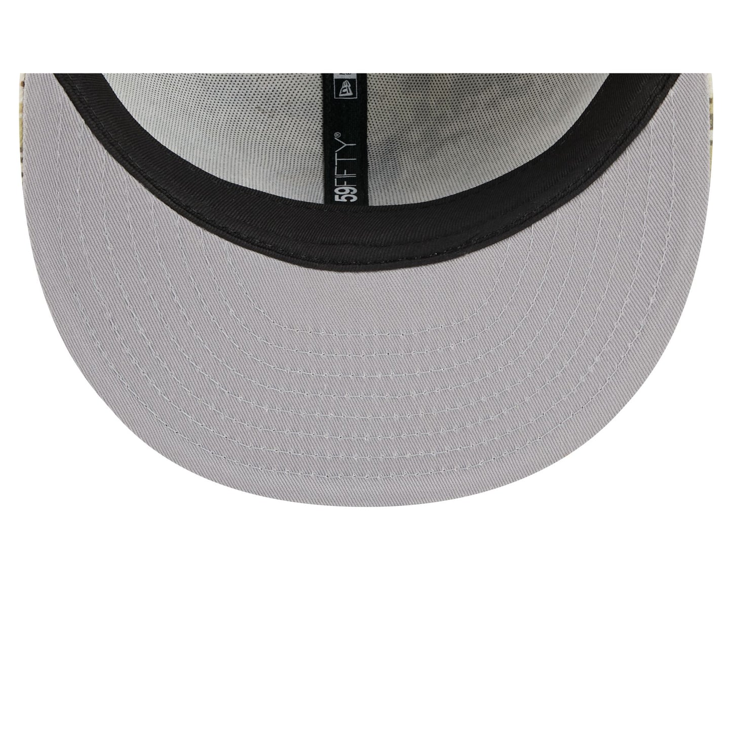 The Minnesota Vikings 2025 Salute to Service Fan Gear 59FIFTY Fitted Cap features an embroidered Vikings logo at the front panels with the official NFL Salute to Service patch at the rear, an American flag patch at the right-wear side, and a gray undervisor.