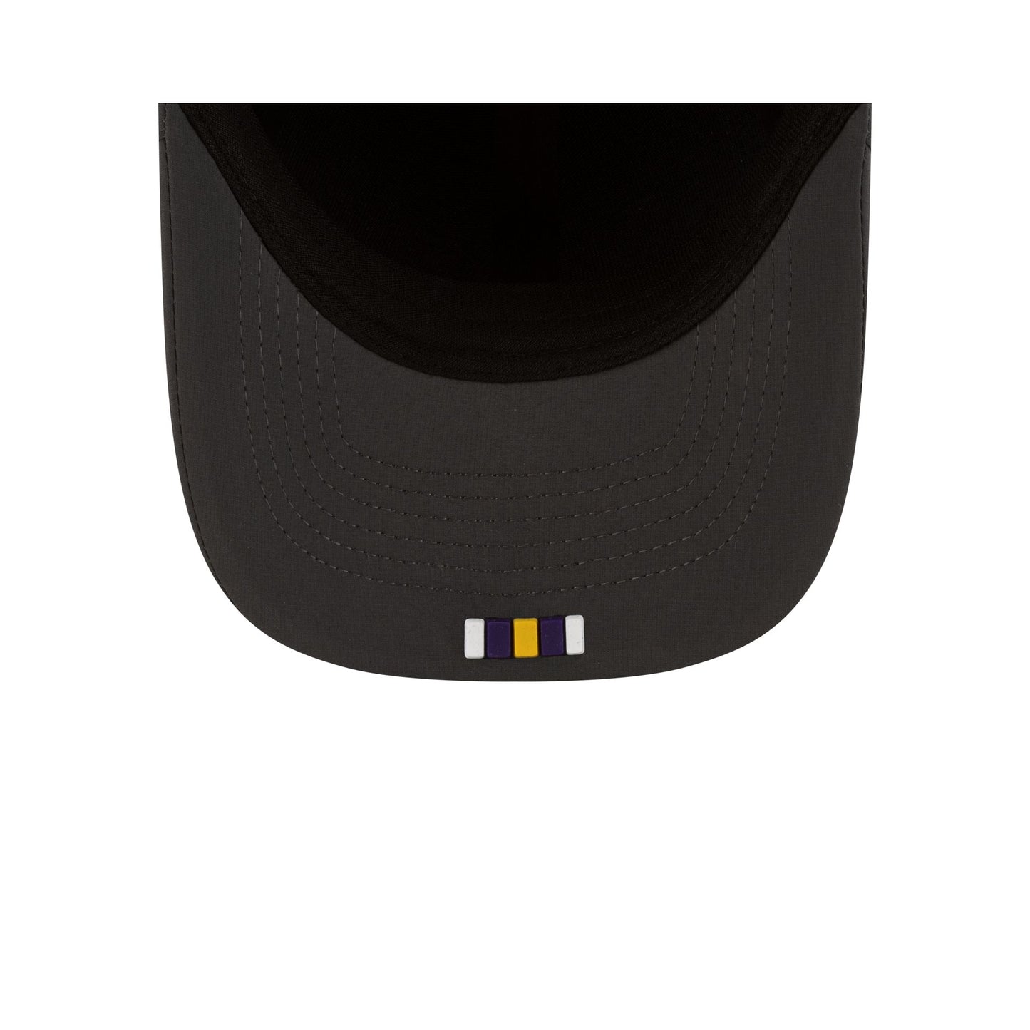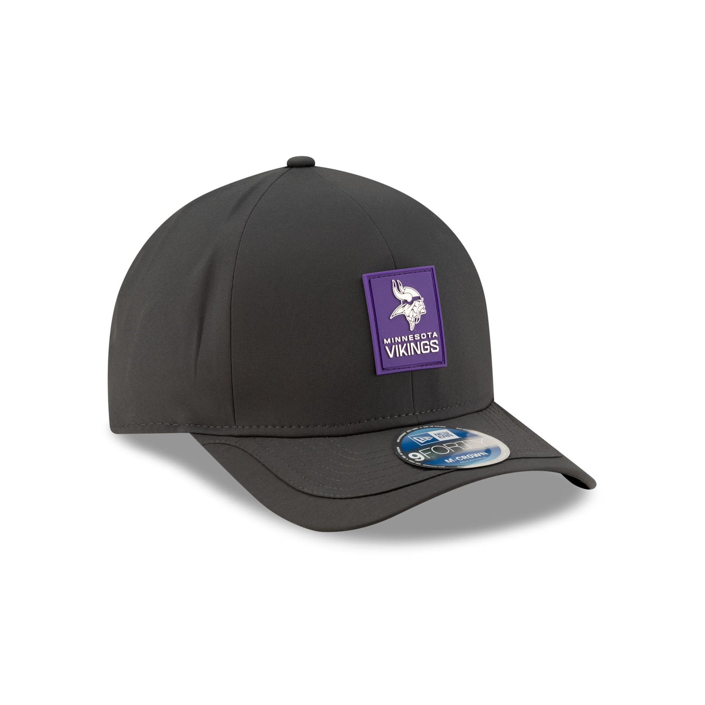 The Minnesota Vikings 2025 Sideline Cold Weather Steel Clouds 9FORTY M-Crown Snapback features a sewn-down silicone Vikings logo patch at the front panels with a water-repellent quill tech fabrication throughout and a quick-dry cushioned sweatband to absorb moisture. Additional details include the Official NFL Shield logo to the right of a soft silicone snapback closure at the rear. The crown has bonded seams to trap warmth and the undervisor is accented with a silicone transfer in the team’s colors.