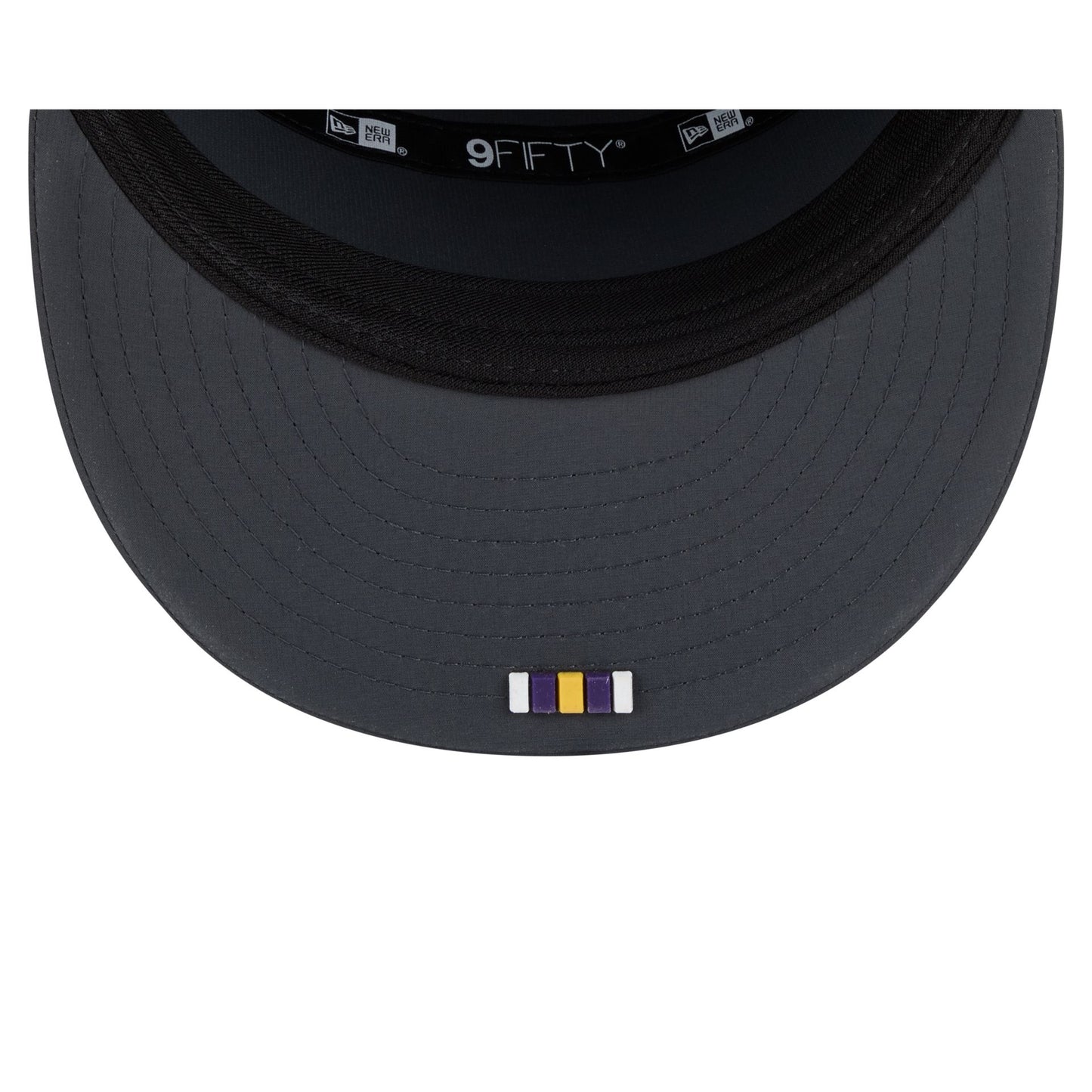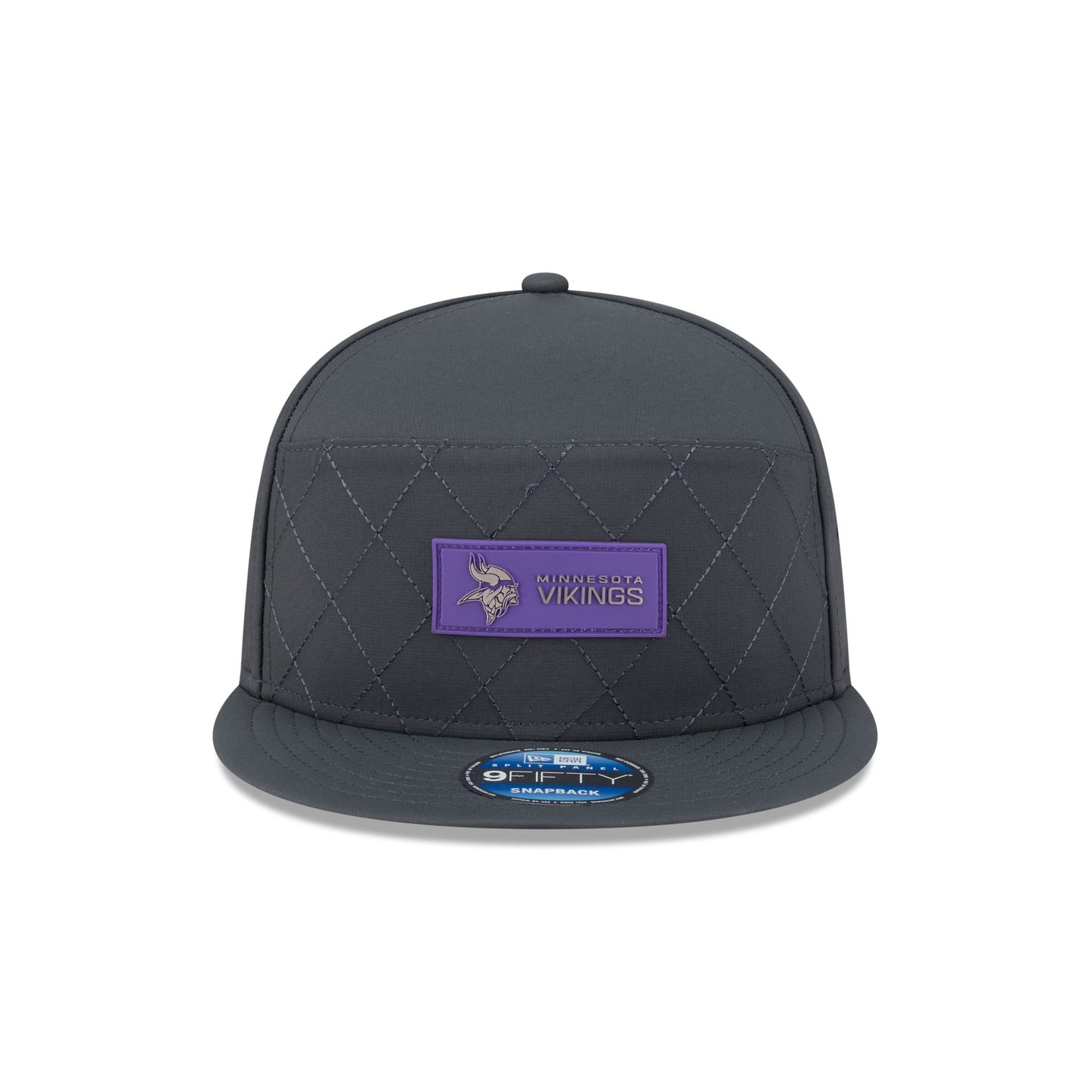 The Minnesota Vikings 2025 Sideline Cold Weather Steel Clouds Split Panel 9FIFTY Snapback features a sewn-down silicone Vikings logo patch at the front panels with a split-crown construction and diamond quilting. The cap has a water-repellent quill tech fabrication throughout, with a quick-dry cushioned sweatband to absorb moisture. Additional details include the Official NFL Shield logo to the right of a soft silicone snapback closure at the rear with eyelets at each side panel. The undervisor is accented with a silicone transfer in the team’s colors.
