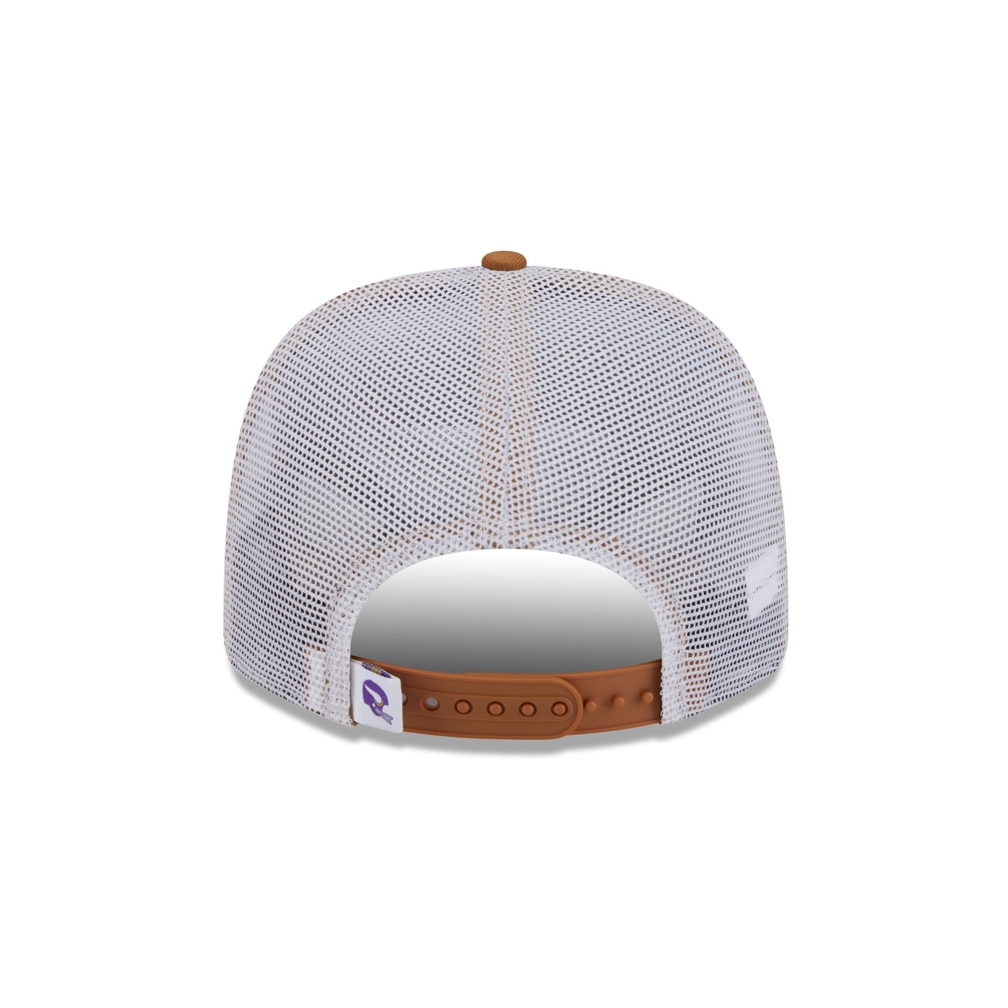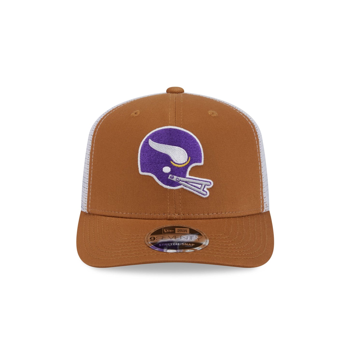 The Minnesota Vikings Bronze 9SEVENTY Trucker features an embroidered Vikings Historic logo at the front panels with a matching woven team tag at a snapback closure at the rear.