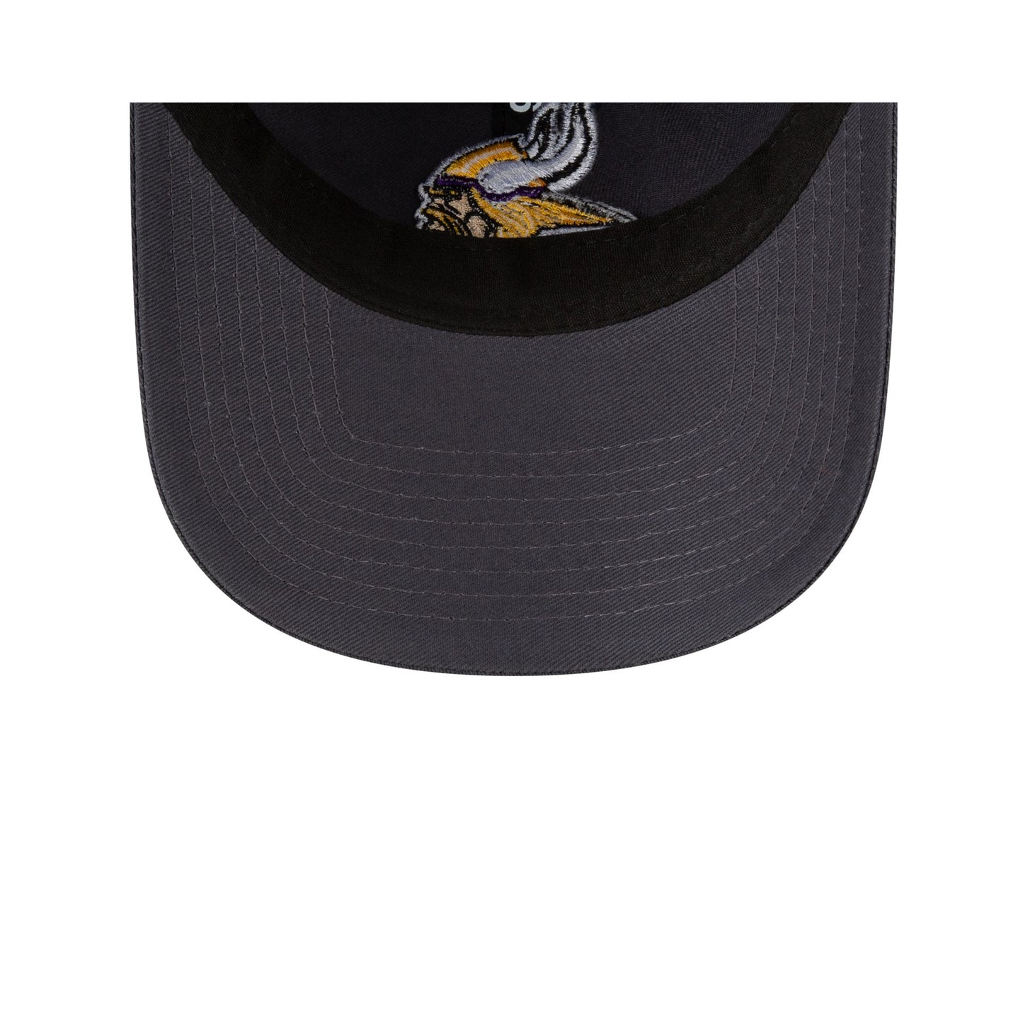 The Minnesota Vikings NFL Core Classic Graphite 9TWENTY Adjustable Cap features an embroidered Vikings logo at the front panels with a woven tab displaying the team logo on a D-Ring closure at the rear.