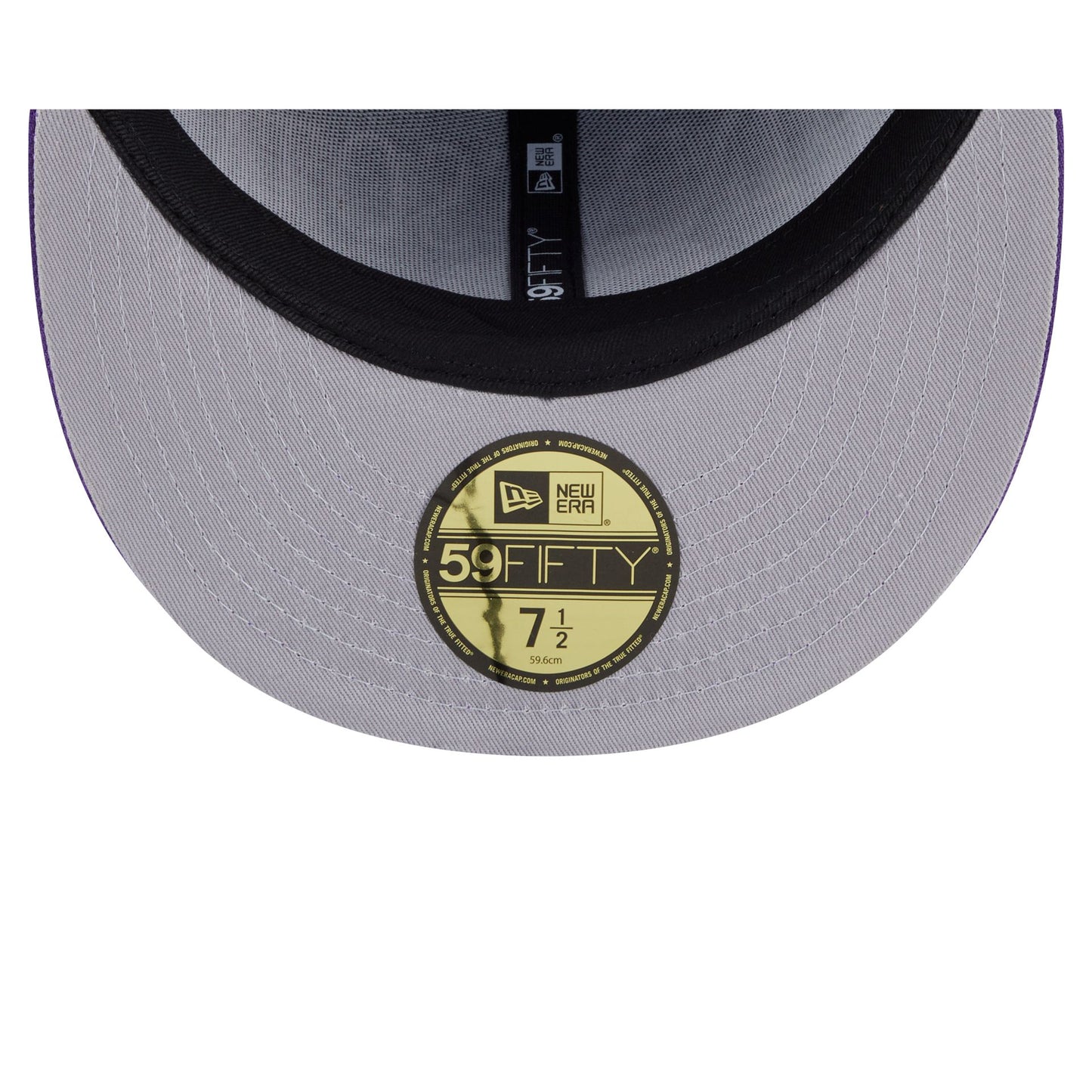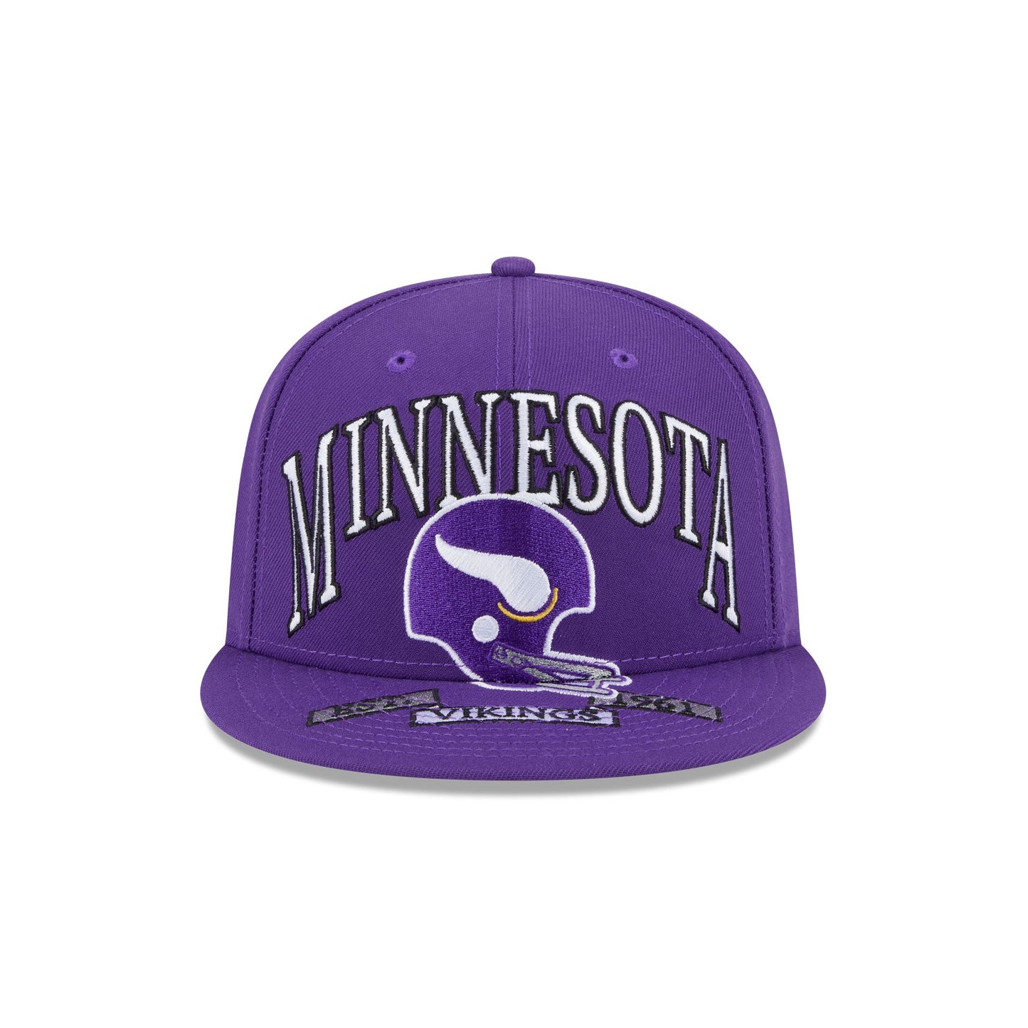 The Minnesota Vikings Oversized 59FIFTY Fitted Cap features an embroidered Vikings Historic oversized graphic at the front panels and visor. Additional details include a logo at the right-wear side, an NFL Shield logo at the rear, and a gray undervisor.