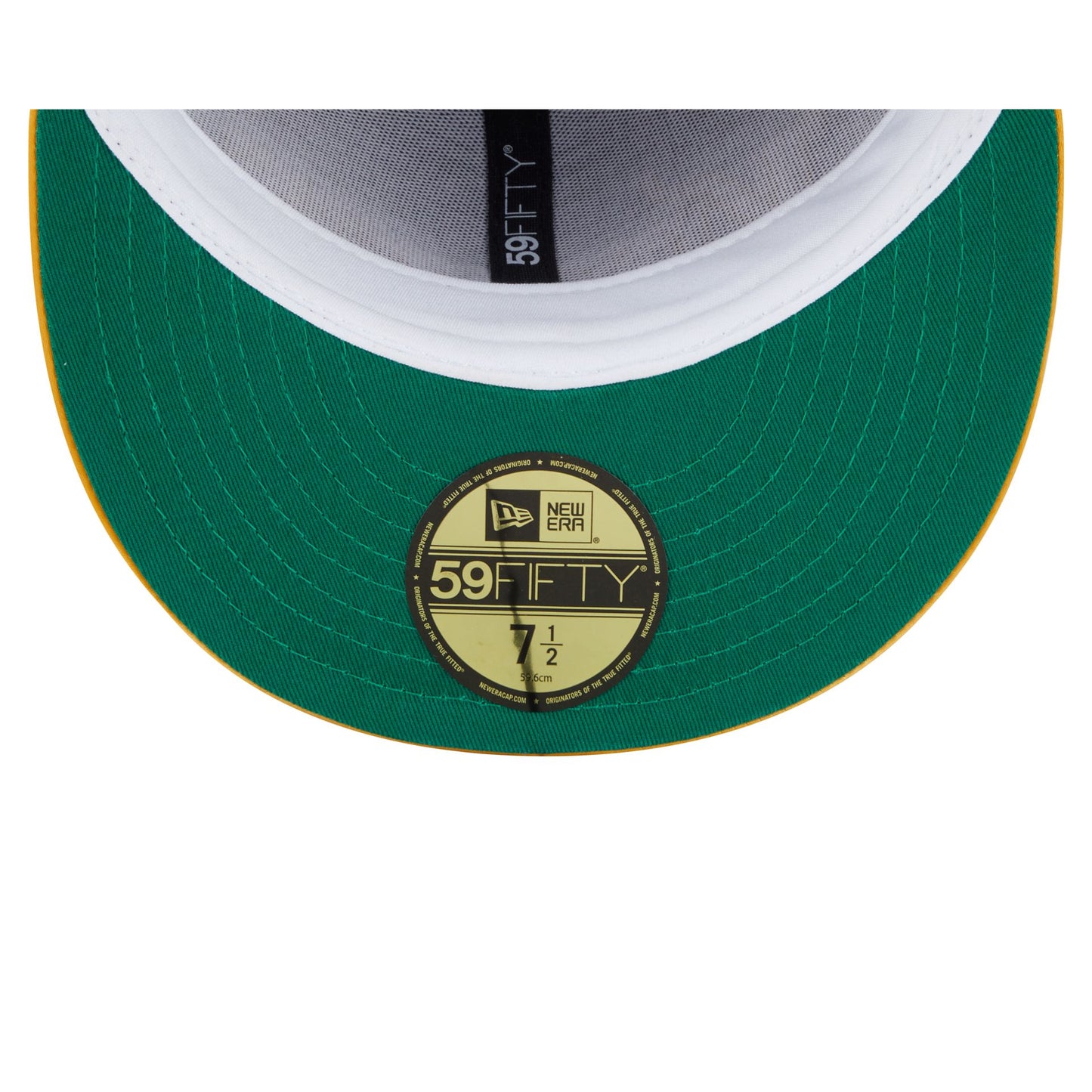 The Minnesota Vikings Spring Satin 59FIFTY Fitted Cap features an embroidered Vikings wordmark at the front panels with a New Era pin at the top left panel and an NFL Shield logo at the rear. Additional details include a satin fabrication throughout, a logo at the right-wear side, and a green undervisor.