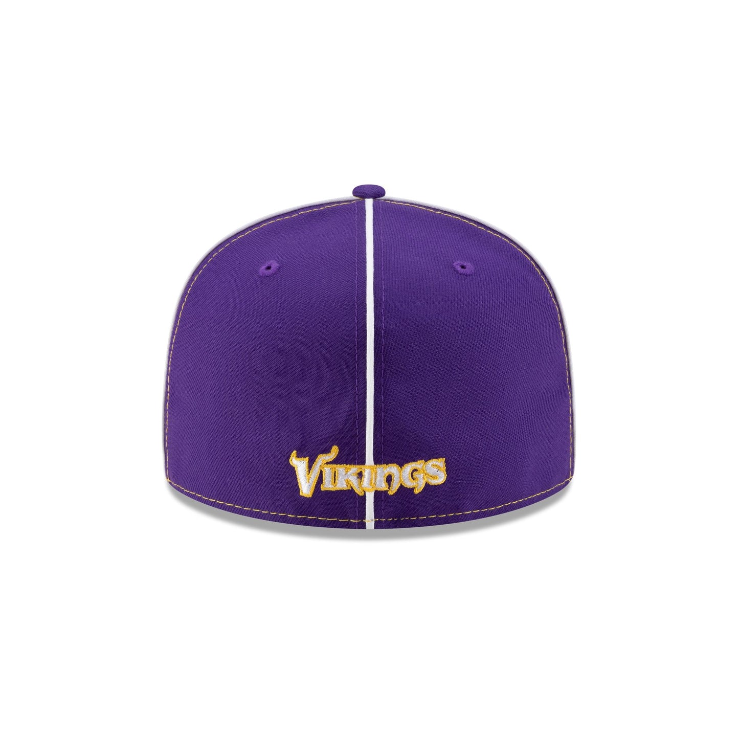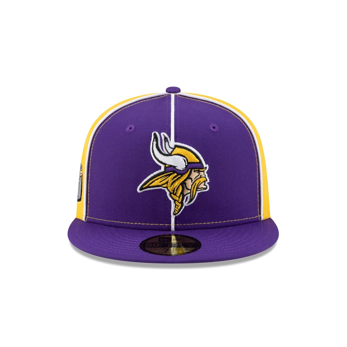 The Minnesota Vikings Two-Tone Pinwheel 59FIFTY Fitted Cap features an embroidered Vikings logo at the front panels with a matching team wordmark at the rear. Additional details include a purple and yellow paneled crown with an XLV Anniversary Season patch at the right-wear side and a gray undervisor.