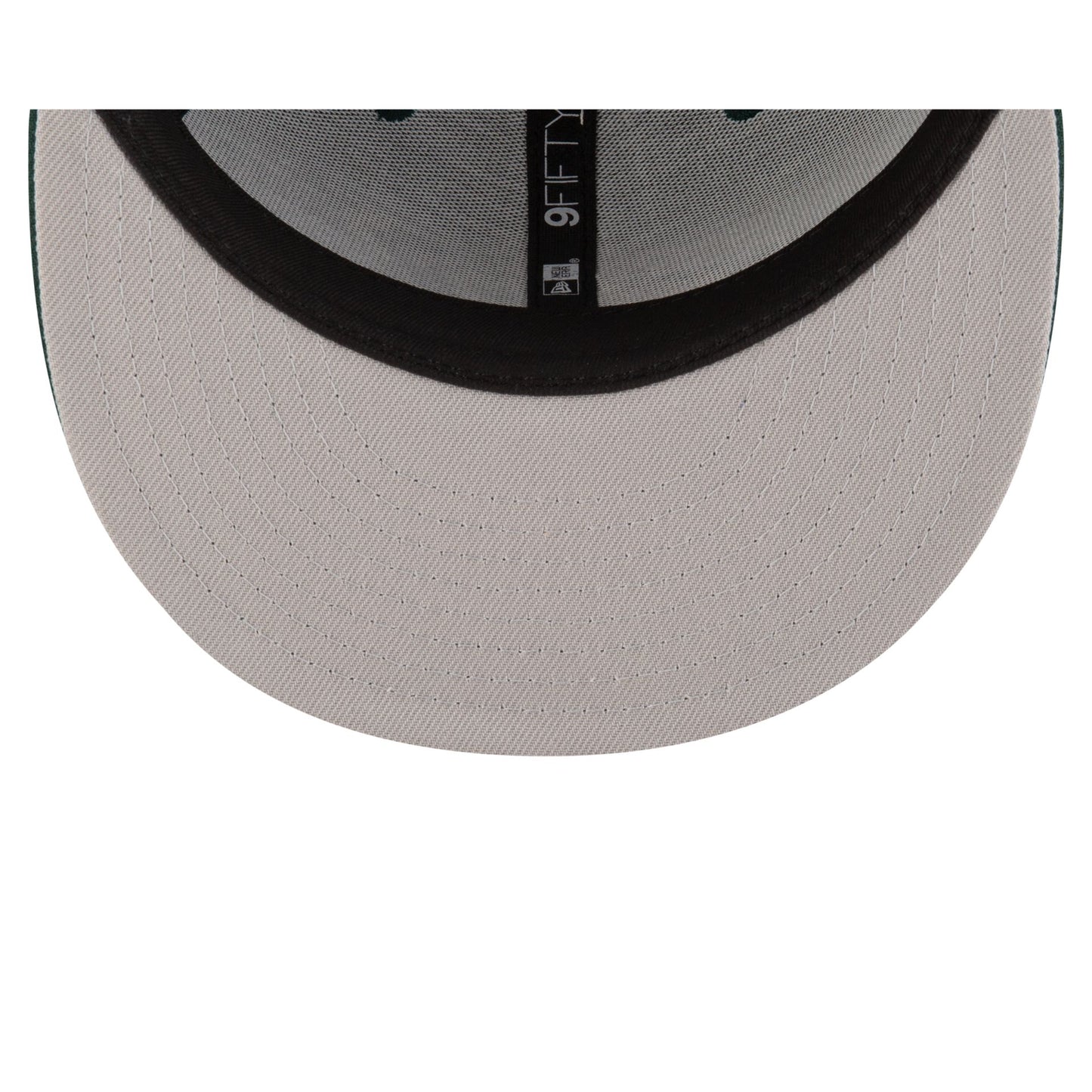 The Minnesota Wild Green 9FIFTY Snapback features an embroidered Wild logo a the front panels with a snapback closure at the rear and a gray undervisor.