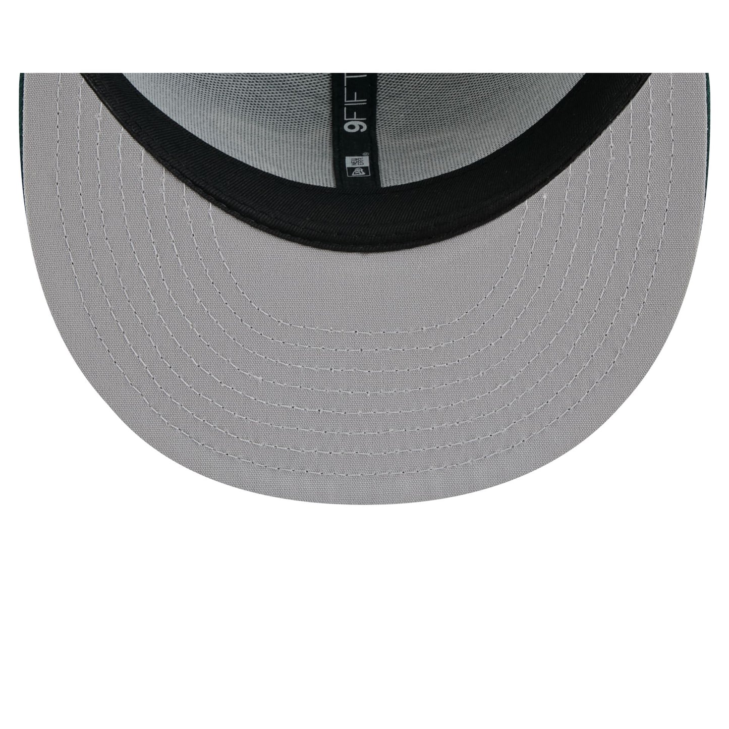 The Minnesota Wild Team Tag 9FIFTY Trucker features an embroidered Wild logo at the front panels with a team tag on an snapback closure at a mesh rear and a gray undervisor.