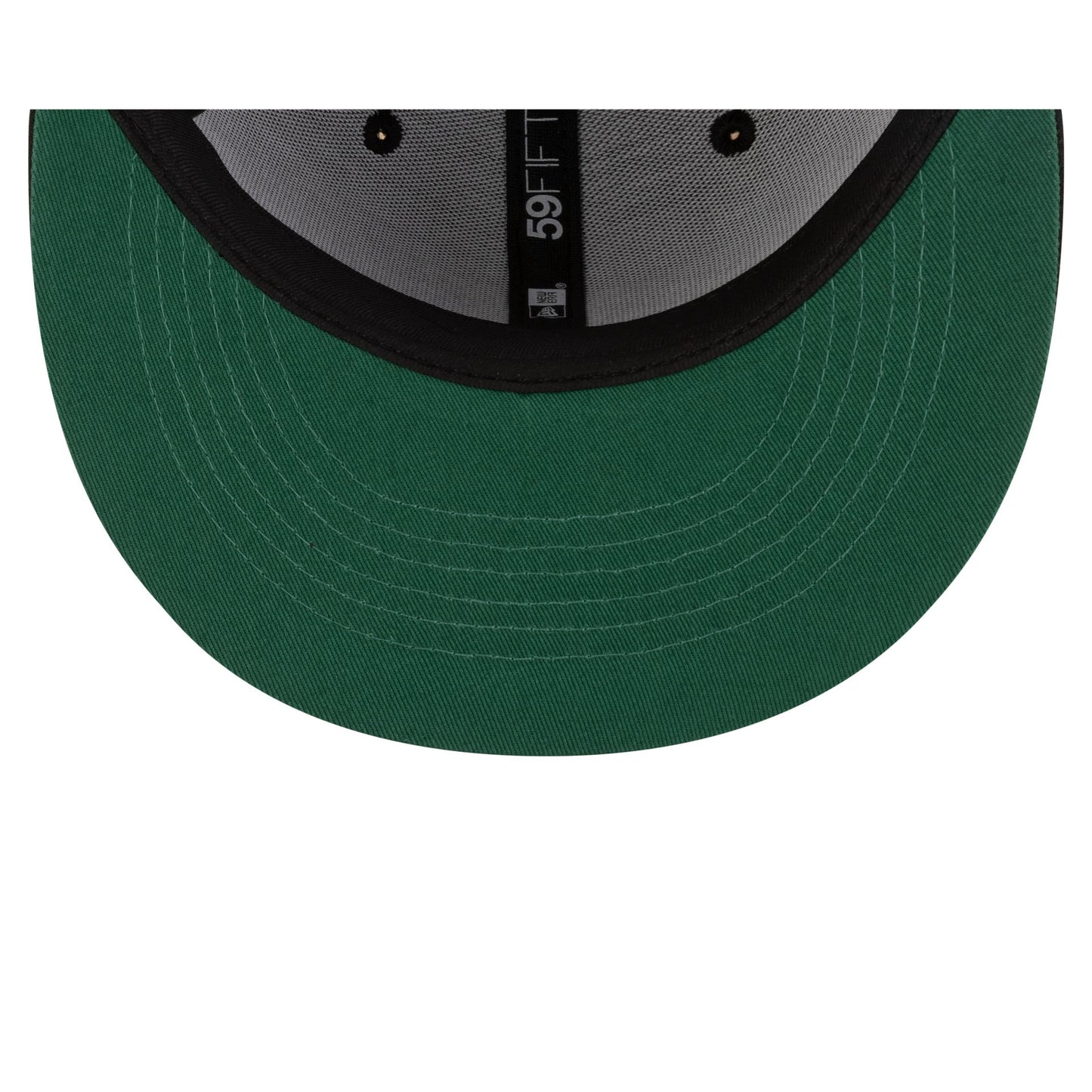 The MLB 2026 MLB World Tour Mexico City Series Arizona Diamondbacks vs. San Diego Padres Black 59FIFTY Fitted features an embroidered Diamondbacks graphic at the right front panel and Padres graphic at the left front panel. Additional details include a 2026 MLB World Tour Mexico City Series wordmark at the right-wear side, the MLB Batterman logo at the rear, and a green undervisor.