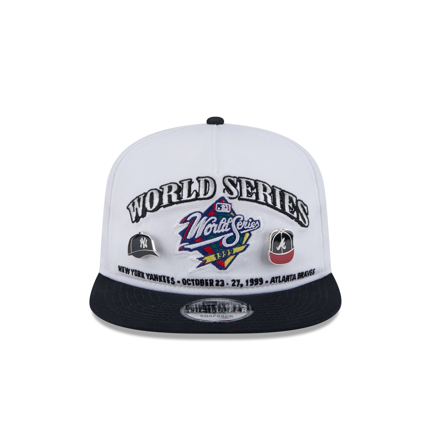 The MLB World Series 1999 Championship Pin Golfer features an embroidered 1999 World Series patch with dueling New York Yankees and Atlanta Braves pins and team wordmarks at the front panels. Additional details include a navy visor with green undervisor and an adjustable snapback closure at the rear.