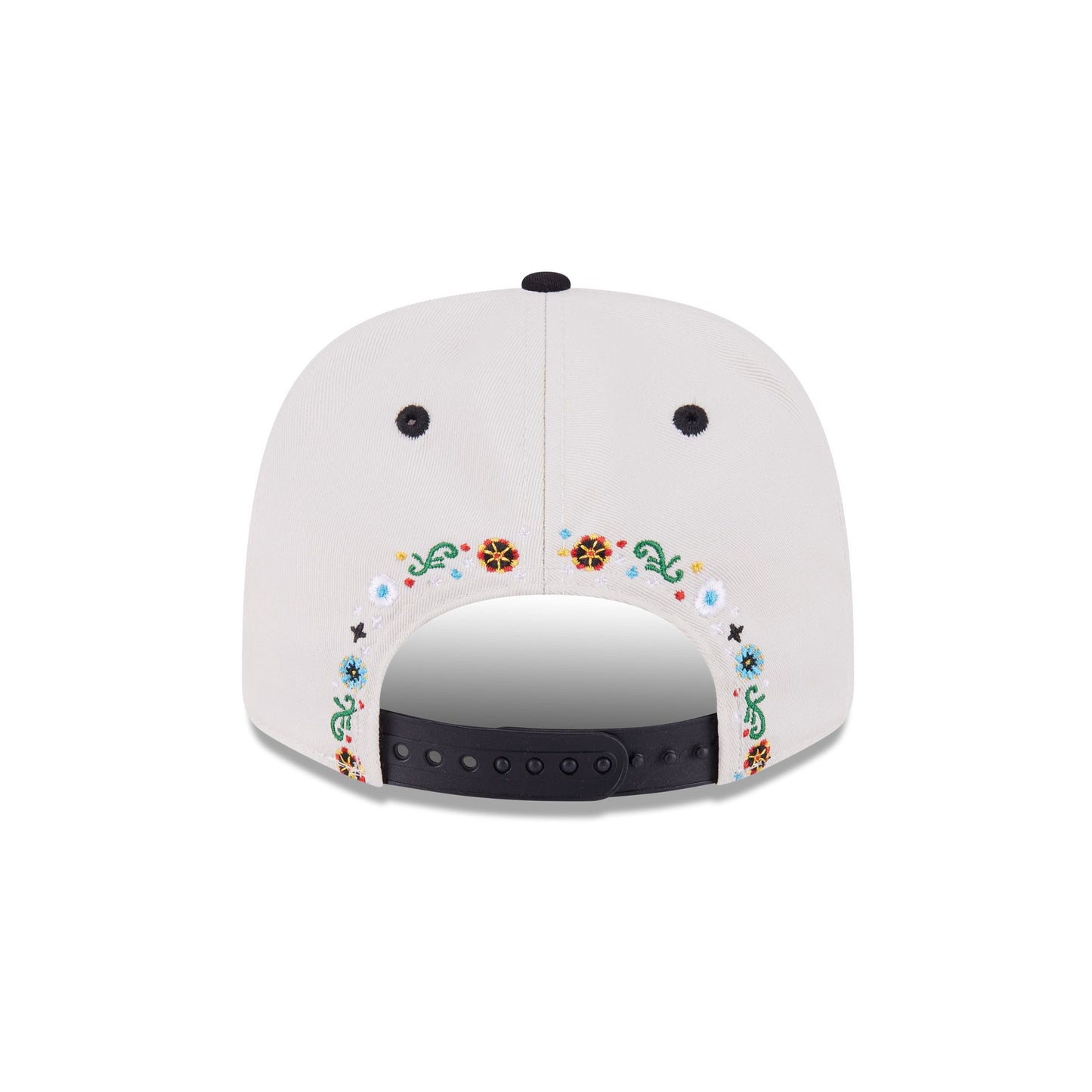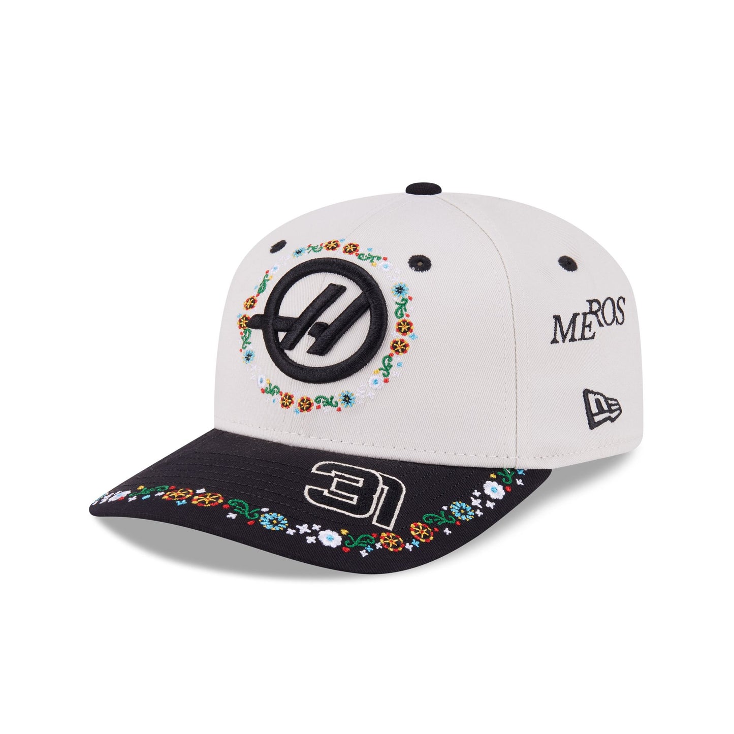 The MoneyGram Haas F1 Team 2025 Mexico City Race Special Esteban Ocon 9SEVENTY Stretch-Snap features an embroidered Haas F1 Team logo at the front panels with floral embroidery throughout the cap and a MoneyGram logo at the right-wear side. Additional details include the driver's number at the visor and an adjustable stretch-snap closure at the rear and a gray undervisor.