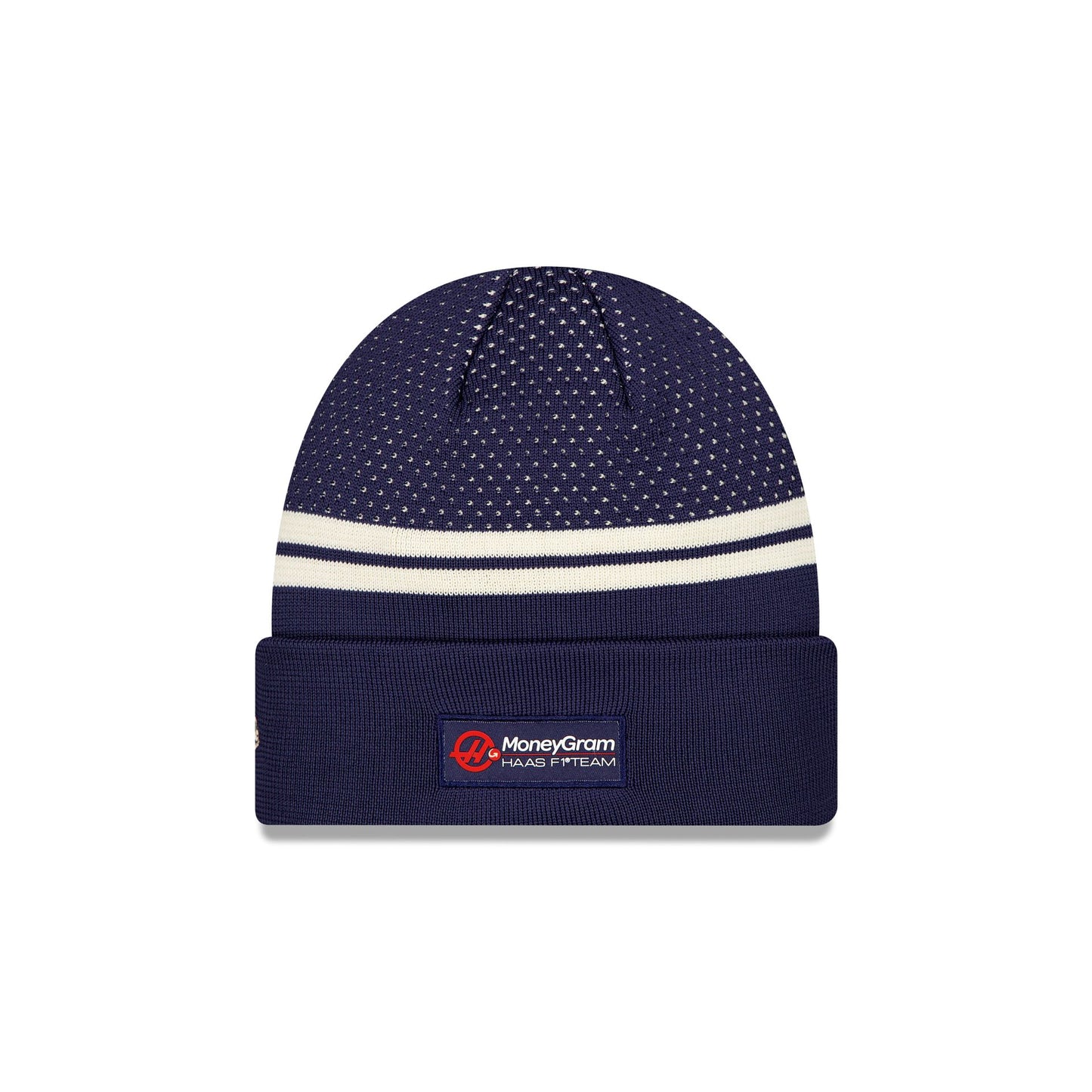The MoneyGram Haas F1 Team Light Navy Cuff Knit Beanie features an embroidered Haas F1 Team logo at the front cuff with a patch at the rear.