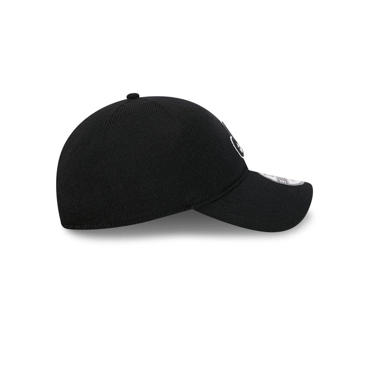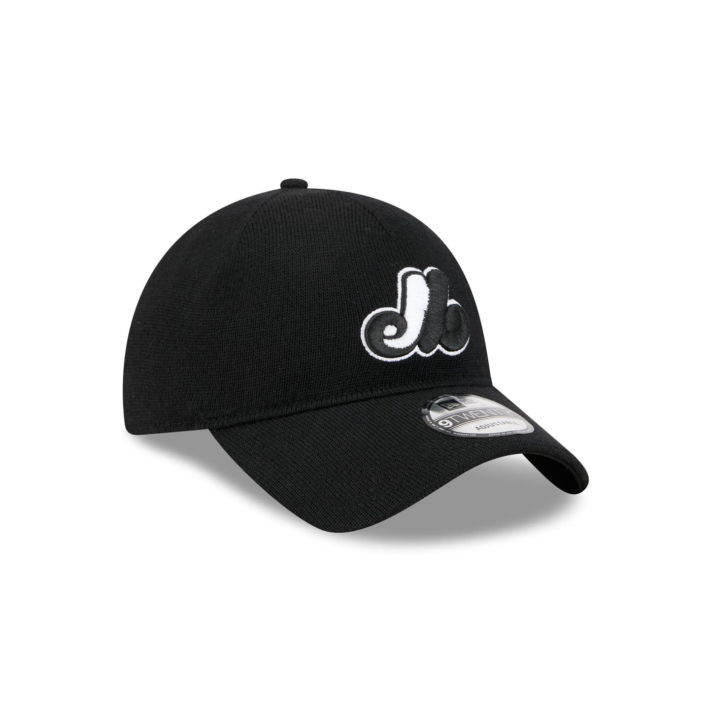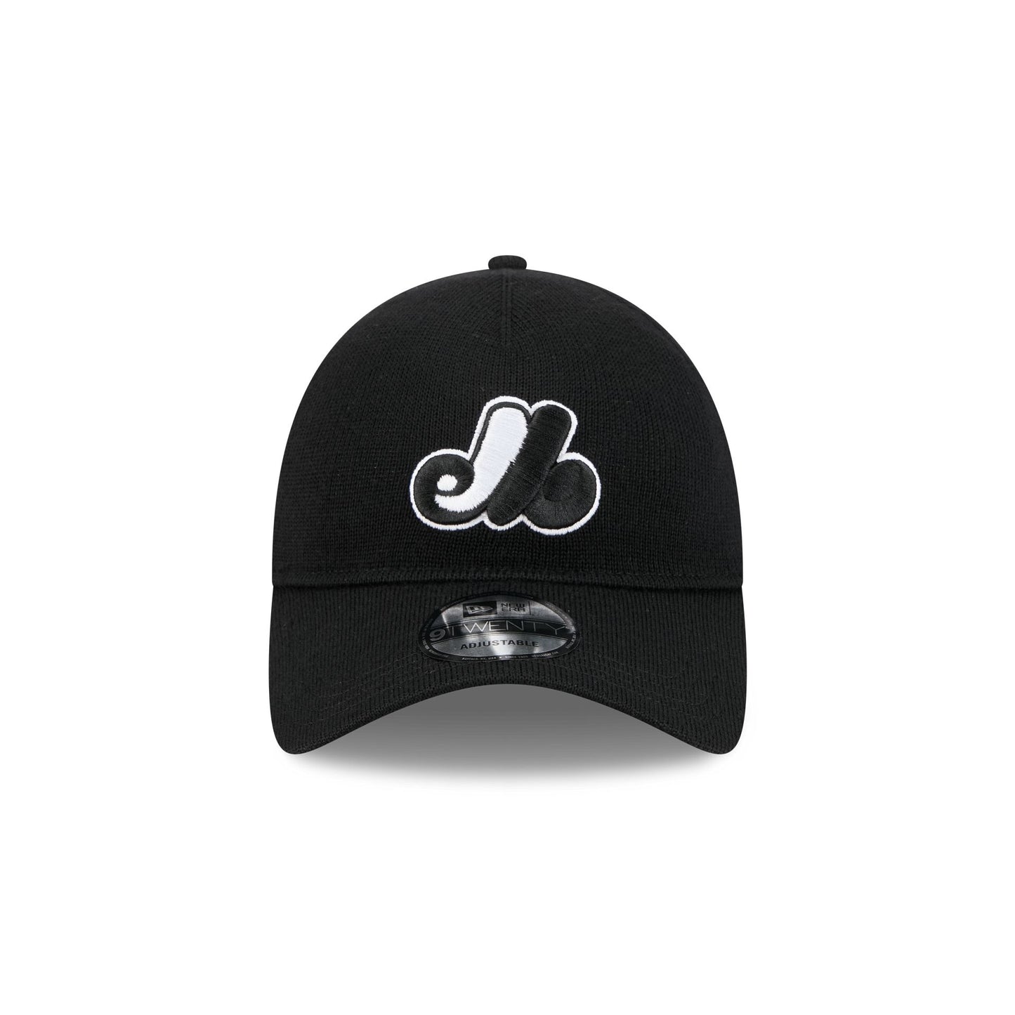 The Montreal Expos Merino Wool Black 9TWENTY Adjustable Cap features an embroidered Expos logo at the front panels with a black undervisor and an adjustable D-Ring closure at the rear.