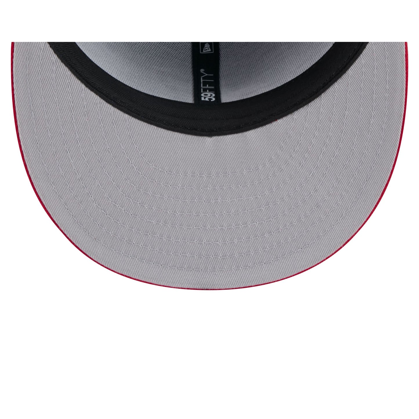 The Montreal Expos Pinstripe League Pin 59FIFTY Fitted Cap features an embroidered Expos Cooperstown logo at the front panels with a League pin at the front right panel. Additional details include pinstripes, a matching MLB Batterman logo at the rear, and a gray undervisor.