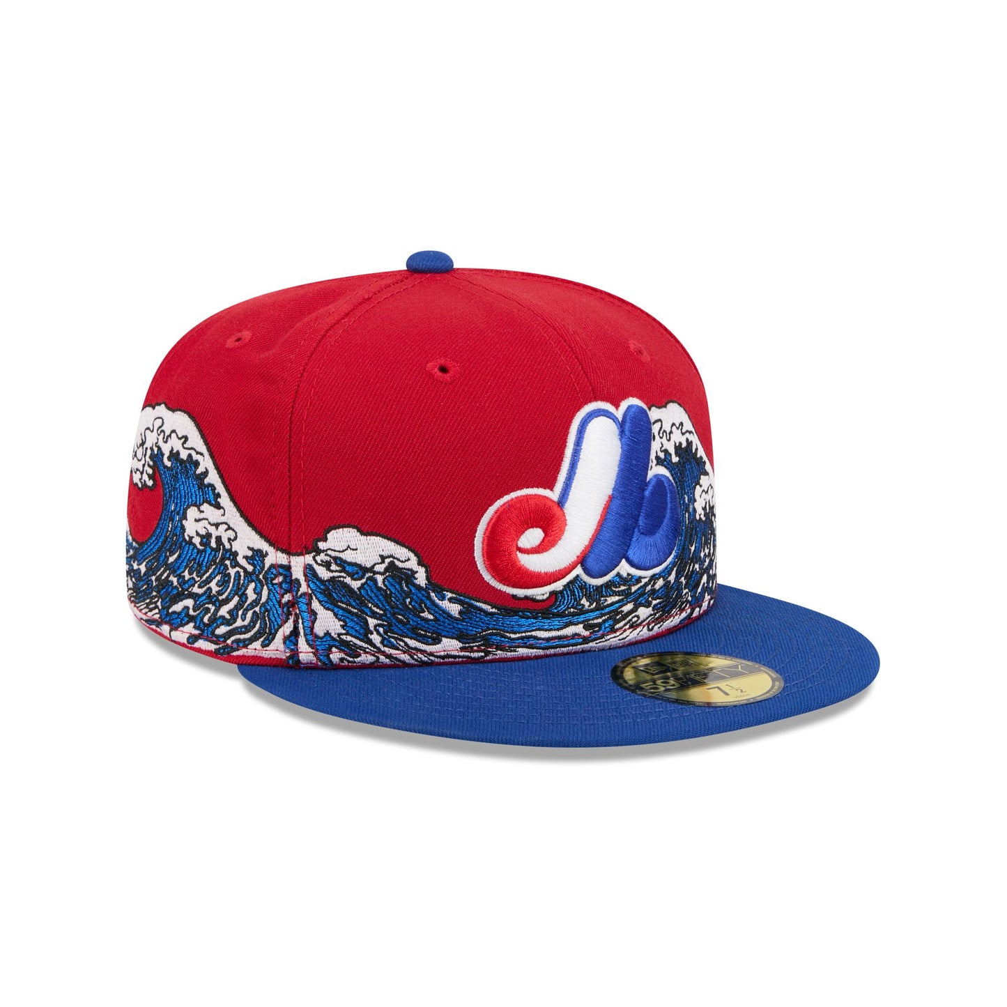 The Montreal Expos Tidal Flow 59FIFTY Fitted Cap features an embroidered Expos Cooperstown logo at the front panels with tidal waves throughout the cap and a gray undervisor.