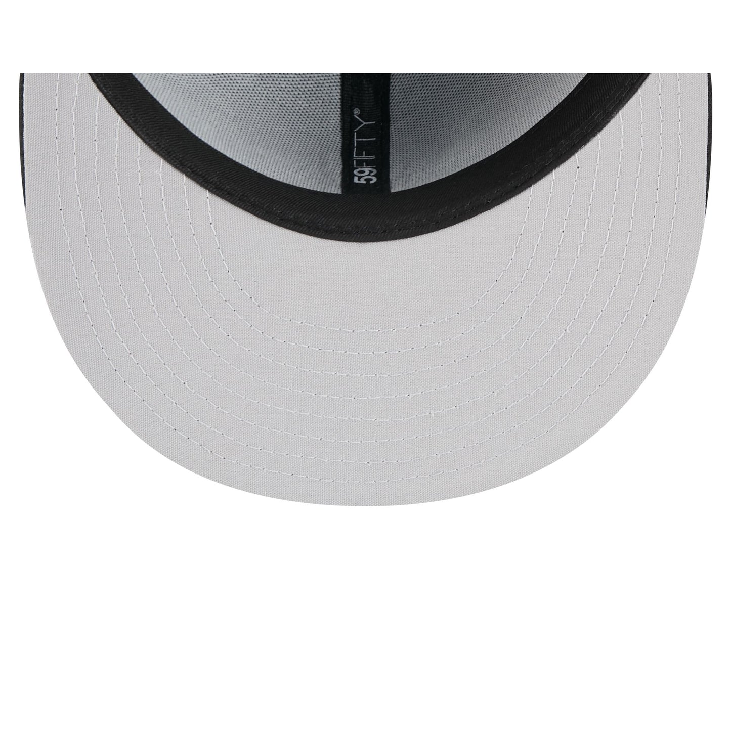 The Myrtle Beach Pelicans Theme Night Black 59FIFTY Fitted Cap features an embroidered Pelicans theme night logo at the front panels with a matching MiLB Batterman logo at the rear and a gray undervisor.